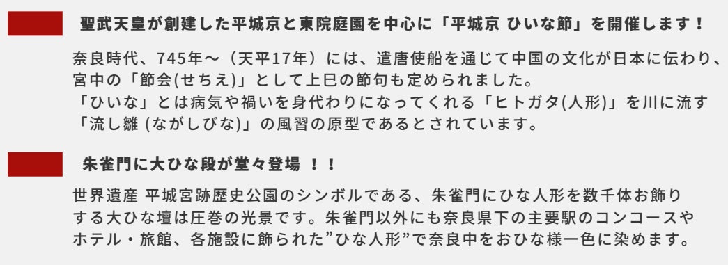 ひいな節では、平城宮跡歴史公園・朱雀門を中心に大ひな壇飾りをおこないます。 ひな人形、ひな壇飾り発祥の奈良で平城宮跡、東院庭園、その他ゆかりの地で皆様からお 譲りいただいた「ひな人形」「つるし雛」を大本山正暦寺の和尚( わじょう) 様の手により 厳粛にご供養したのち、令和8年2月21日~4月12日の期間、丁重にお飾りいたします。