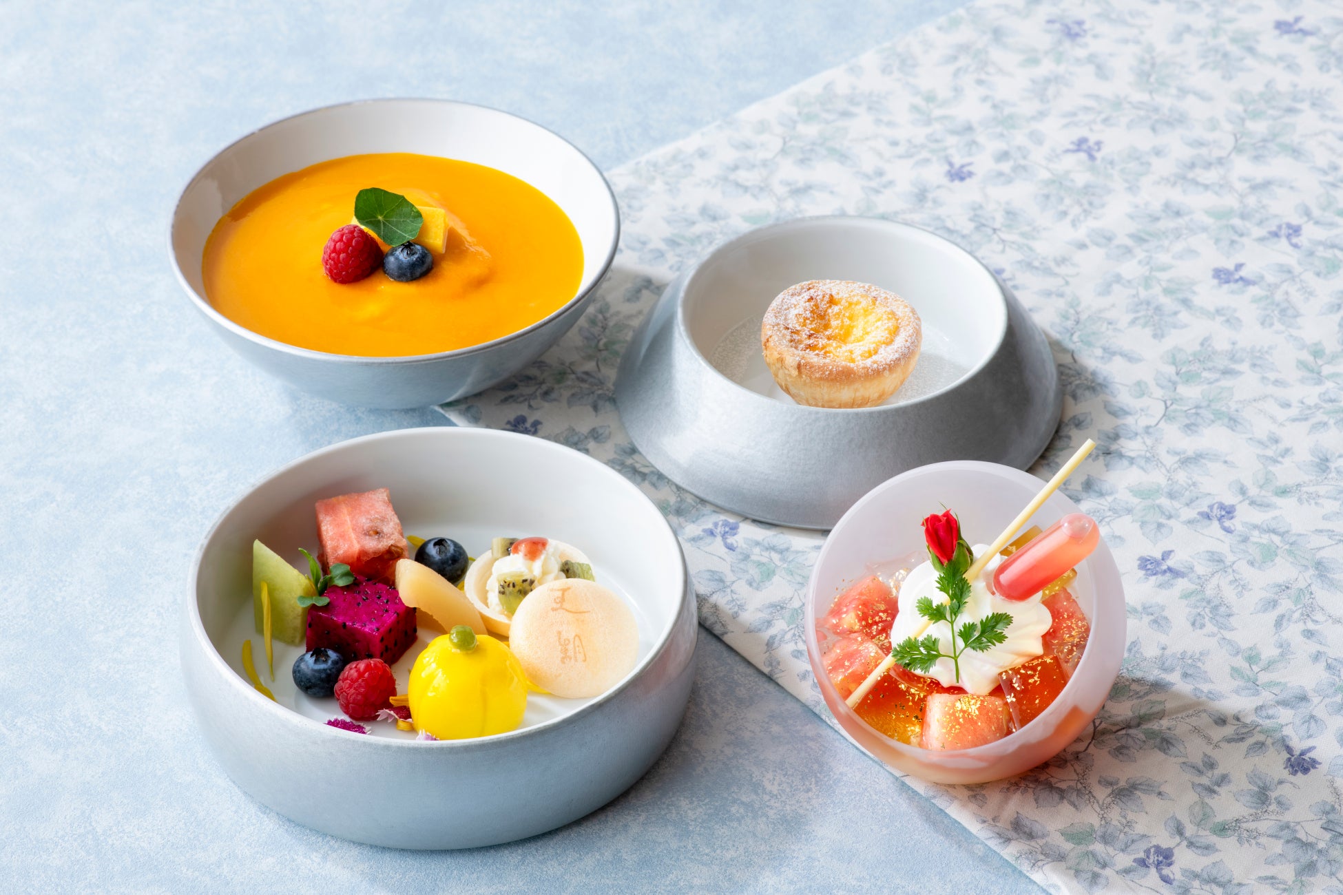 セイボリーには、中国国家認定の高級点心師 黄(コウ)シェフが手掛ける「鮑のシューマイ」が登場。鮑を贅沢に1個のせ、噛むごとに鮑の旨味と香りが口いっぱいに広がる点心です。その他、中国料理でおなじみの皮蛋(ピータン)は新生姜と、クラゲの冷菜は有馬山椒と合わせ、ピリッと爽やかな夏らしい味わいに仕上げています。デザートには、夏らしいトロピカルフルーツを随所に使用したメニューなど全6種をご用意。定番のマンゴープリンは完熟マンゴーの果肉とソースを合わせ、エッグタルトにはドリアンを使用するなど、夏らしいトロピカルな食材とシェフのオリジナルメニューの融合をお楽しみいただけます。ペストリーシェフが手掛けるパフェは、旬のすいかとレアチーズケーキ、そして鉄観音烏龍茶のゼリーを合わせたジューシーで爽やかな一品です。