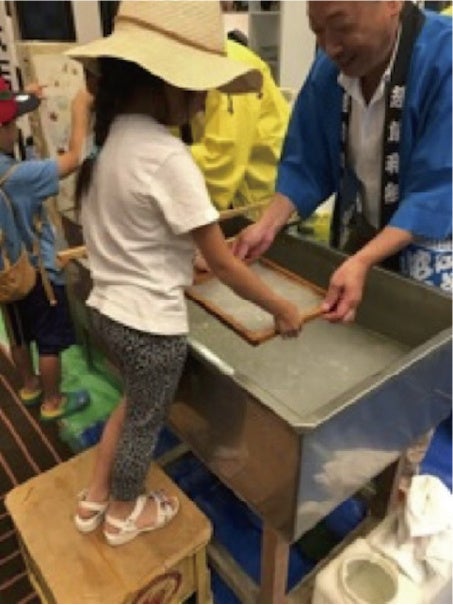 和紙の原料を使って紙を漉き、伝統の技法を使って押し花などの装飾を加えます。