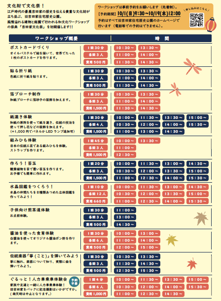 文化財で文化祭!江戸時代の豪農吉田家の歴史を伝える貴重な文化財が建ち並ぶ、旧吉田家住宅歴史公園で小中学生向けの和文化ワークショップの祭典『吉田家文化祭』を初開催します。