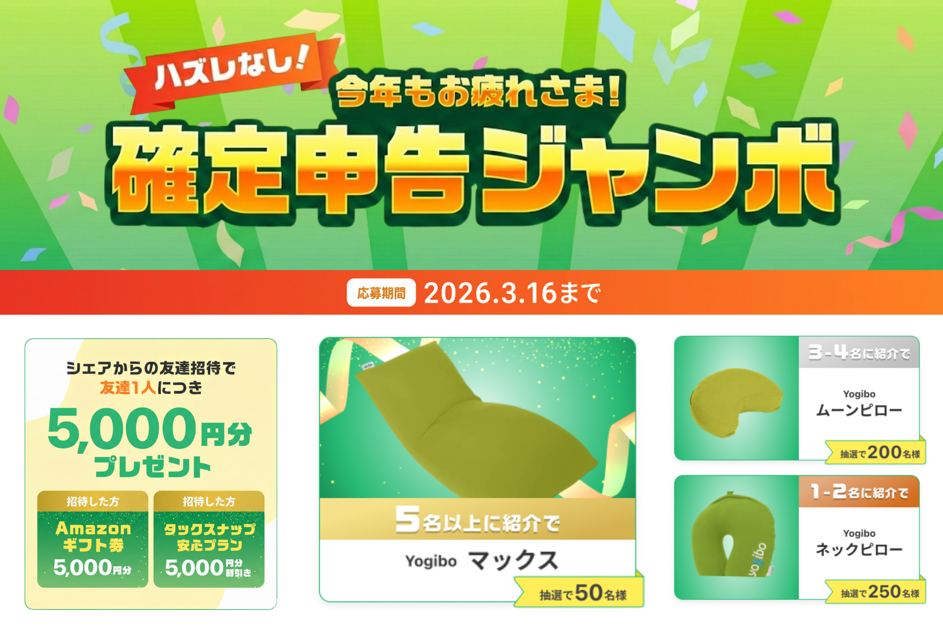 株式会社タックスナップ(代表取締役CEO:田中 雄太、本社:東京都杉並区)は、2026年1月19日(月)より、確定申告アプリ「タックスナップ」にて「確定申告ジャンボ」キャンペーンを実施いたします。
