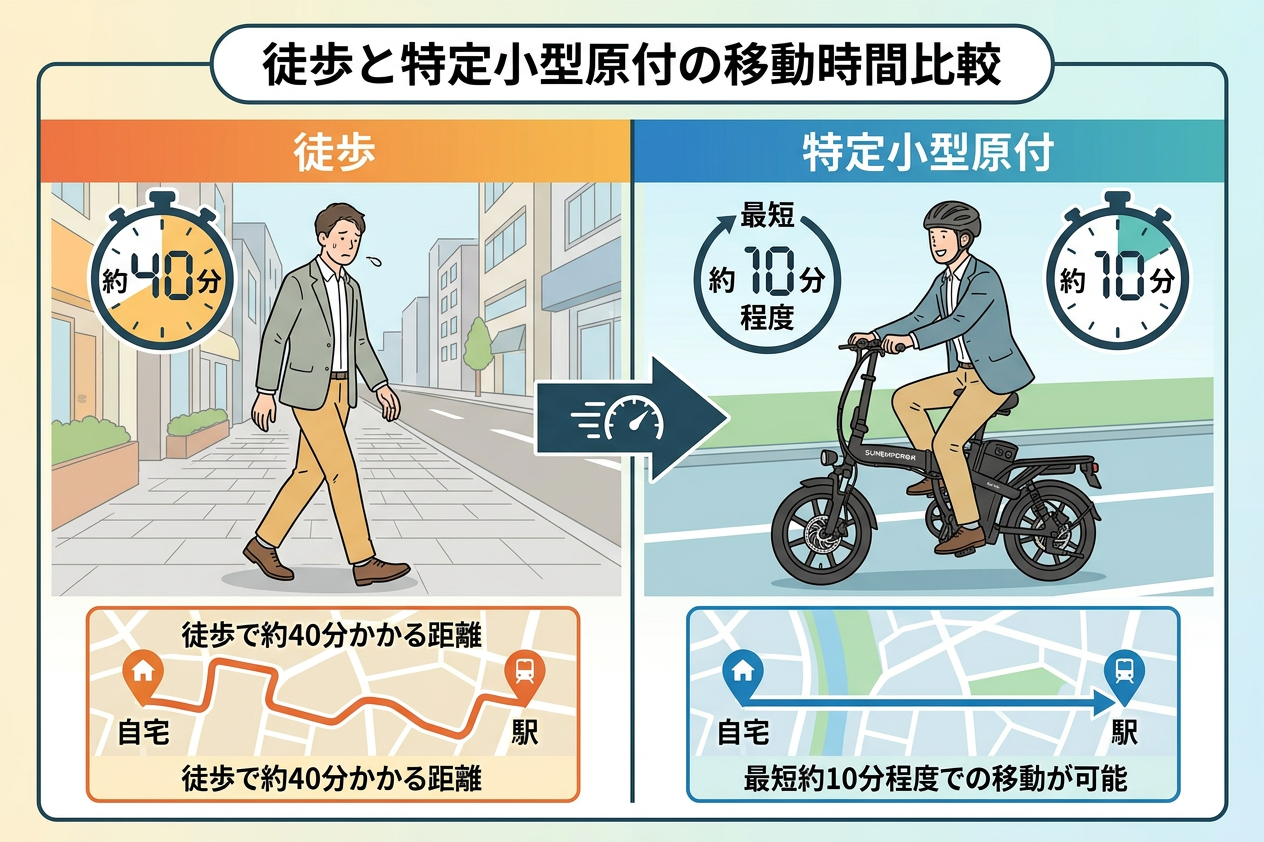 しかし、特定小型原動機付自転車であれば、最高速度20km/hでの走行が可能なため、徒歩で約40分かかる距離でも、最短で約10分〜15分程度での移動が可能となります。