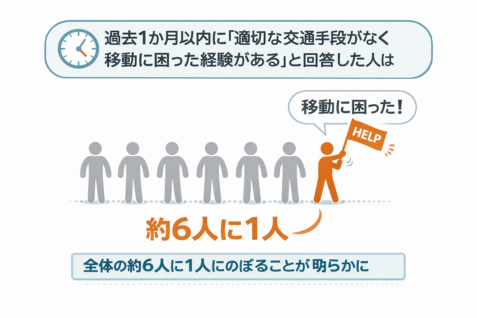 過去1か月以内に「適切な交通手段がなく移動に困った経験がある」と回答した人は、 全体の約6人に1人にのぼることが明らかになっています。