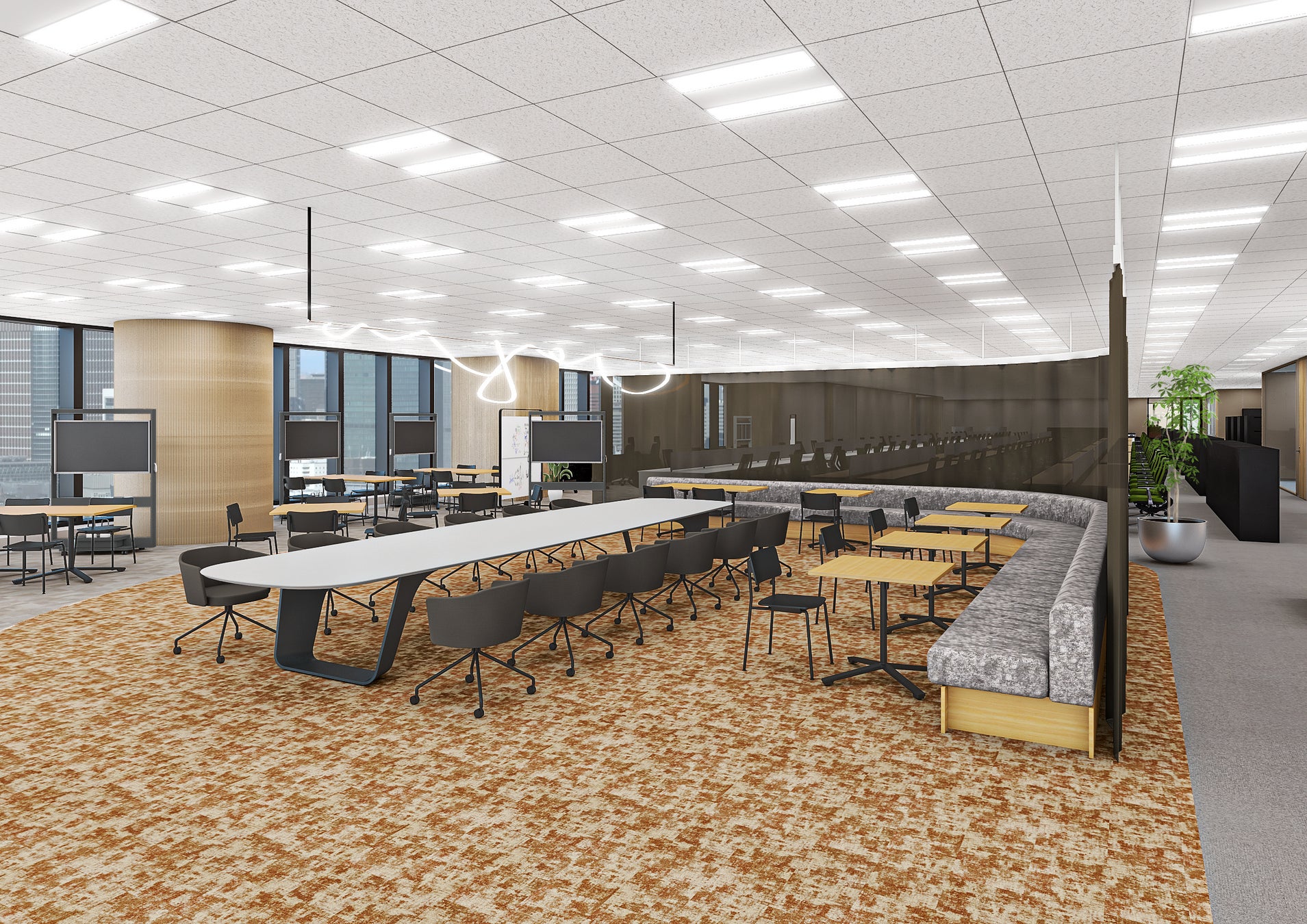 新オフィスは、「価値を生み出す場」「つながる場」「来たくなる場」を基本コンセプトに、社員の意見を取り入れながら設計されています。また、フリーアドレスを採用する執務エリアの席数拡大だけではなく、業務内容に合わせて時間や場所を自由に選択できる働き方である「Activity Based Working (ABW)」に活用できるエリアも拡充させることで、クリエイティビティおよびコミュニケーションの向上を図ります。新オフィスで社員のチームワークが十分に機能し、「自分らしく」働きながらプロフェッショナルとして価値創造を促す環境を整えることで、当社が掲げる二軸経営を加速させていきます。