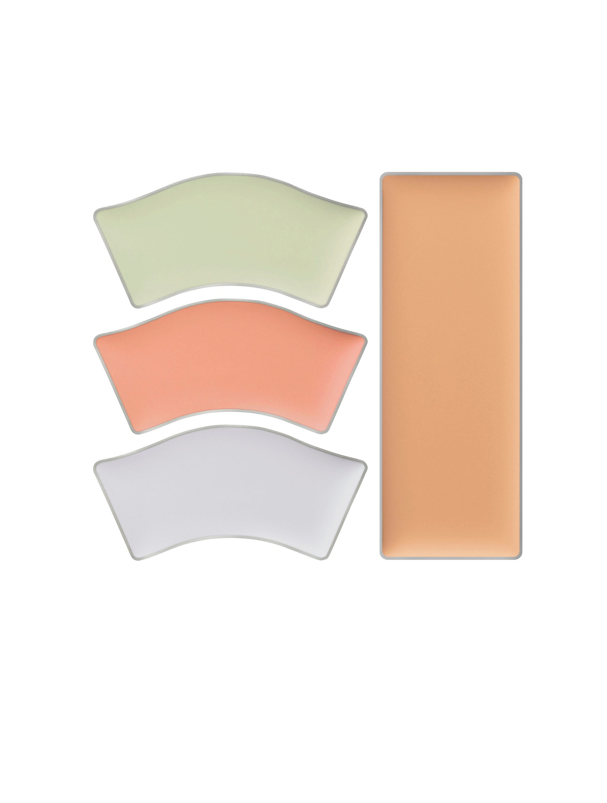 赤みをカバーする「ライトグリーン」、クマをカバーして明るさを与える「ベビーピンク」、くすみをカバーして透明感を与える「クリアブルー」、シミや凹凸をカバーする「ナチュラルベージュ」をセットしました。1品で幅広い肌悩みをカバーし、明るい透明感を引き出します。