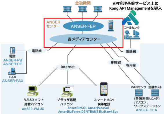 「ANSER」は、金融機関の窓口やATMで行っていた金融取引(残高照会や入出金明細の連絡、顧客の口座からの振込・振替など)を会社や自宅、外出先などでも利用できるサービスです。顧客は固定電話・携帯電話・パソコンなどさまざまな端末を利用することができます。1981年からサービスしており、45年以上に亘る信頼と実績に基づくサービスで、全国で700以上の金融機関に利用されております。