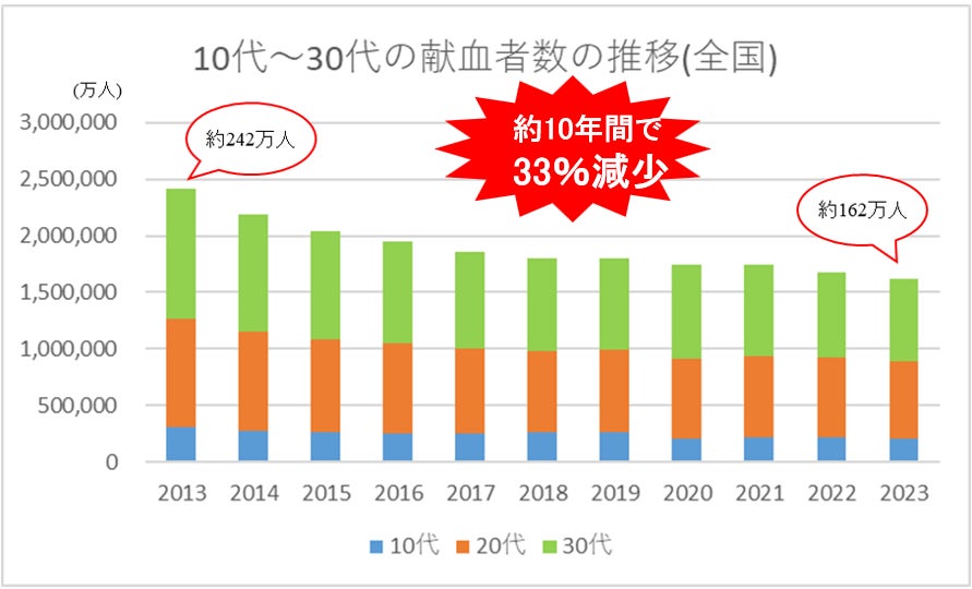 日本国内では、少子高齢化により献血可能人口が減少しています。さらに、10代~30代の献血協力者数はこの約10年間で33%(2013年約242万人から2023年約162万人の約80万人)も減少しています。