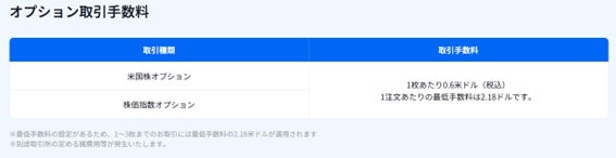 米国株式オプション取引の手数料は、1枚あたり0.6米ドル(最低手数料2.18米ドル)。