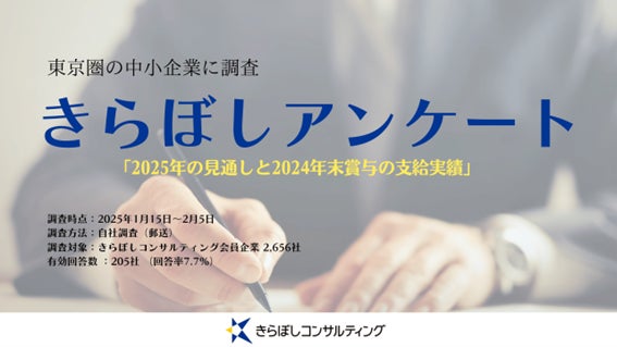 「金融にも強い総合サービス業」を将来像に掲げるきらぼしグループの株式会社きらぼしコンサルティング(本社:東京都港区、代表取締役社長 中野良明)では、会員企業を対象に年3回のアンケート調査を実施しております。この度、本年1月に実施した「2025年の見通しと2024年末賞与の支給実績」に関する調査結果を公開いたしました。