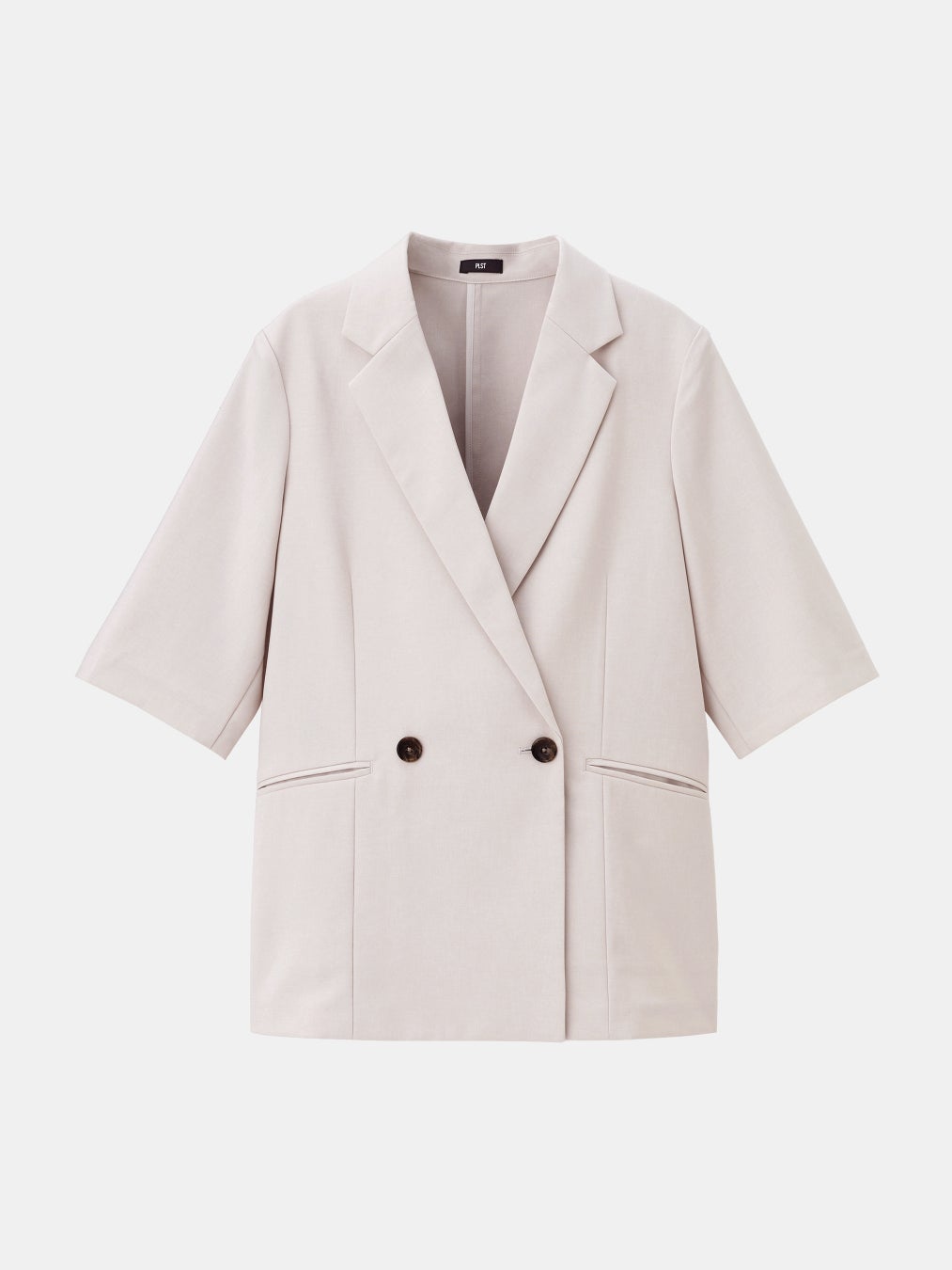 「このお悩みには、”きちんと感”のあるデザインとひんやり心地いい接触冷感機能付きの『プラステクール』がおすすめです!」と桐谷さん。女性モデルが着用する「プレミアムオックスハーフスリーブジャケット」は、「半袖で裏地もないので、軽くて涼しいのが大きなポイントです。半袖だけど肘が隠れる丈感なので、モードな雰囲気でおしゃれにみえるのもいいですよね。」と紹介。内田さんも「確かに、肘が隠れているだけで、ビジネスシーンでも違和感なく、落ち着いた雰囲気やきちんとした印象を与えられそうでいいですね!」と関心した様子でした。