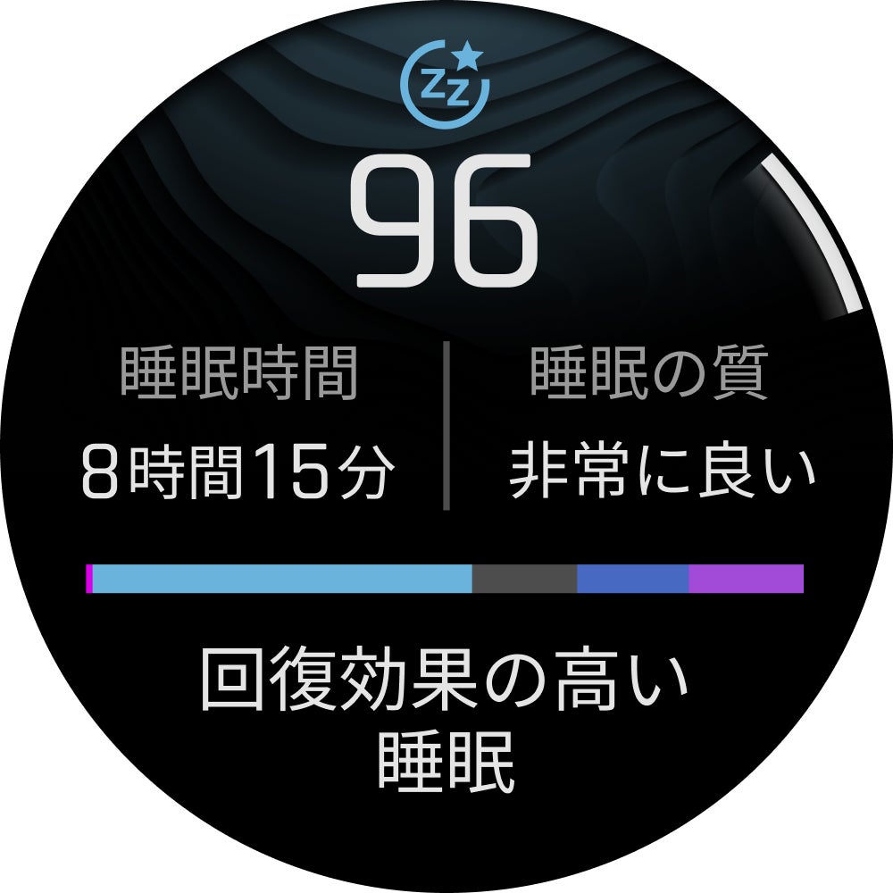 Garminの睡眠機能は単なる計測にとどまらず、計測したデータを分析し、一人ひとりに合わせてより良い睡眠のための提案までを行います。100までの数値で睡眠を評価する「睡眠スコア」をはじめとし、睡眠時間やストレス、日中の活動、旅行などのデータをもとにパーソナライズされた睡眠改善のアドバイスを提案する「睡眠コーチ」や、昼寝や仮眠も計測し、その長さやタイミングもアドバイスする「お昼寝検出」も搭載。睡眠中の心拍変動を確認できる「HRV(心拍変動)ステータス」 は、自律神経の状態を確認する指標となります。 -