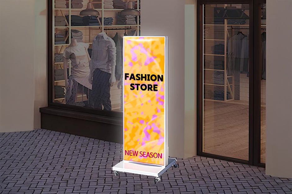LED内蔵で昼夜問わず視認性が高く、キャスター付きで設置・移動もスムーズ。間口が狭い小規模店舗や、路面の観光案内拠点などでも活躍します。
