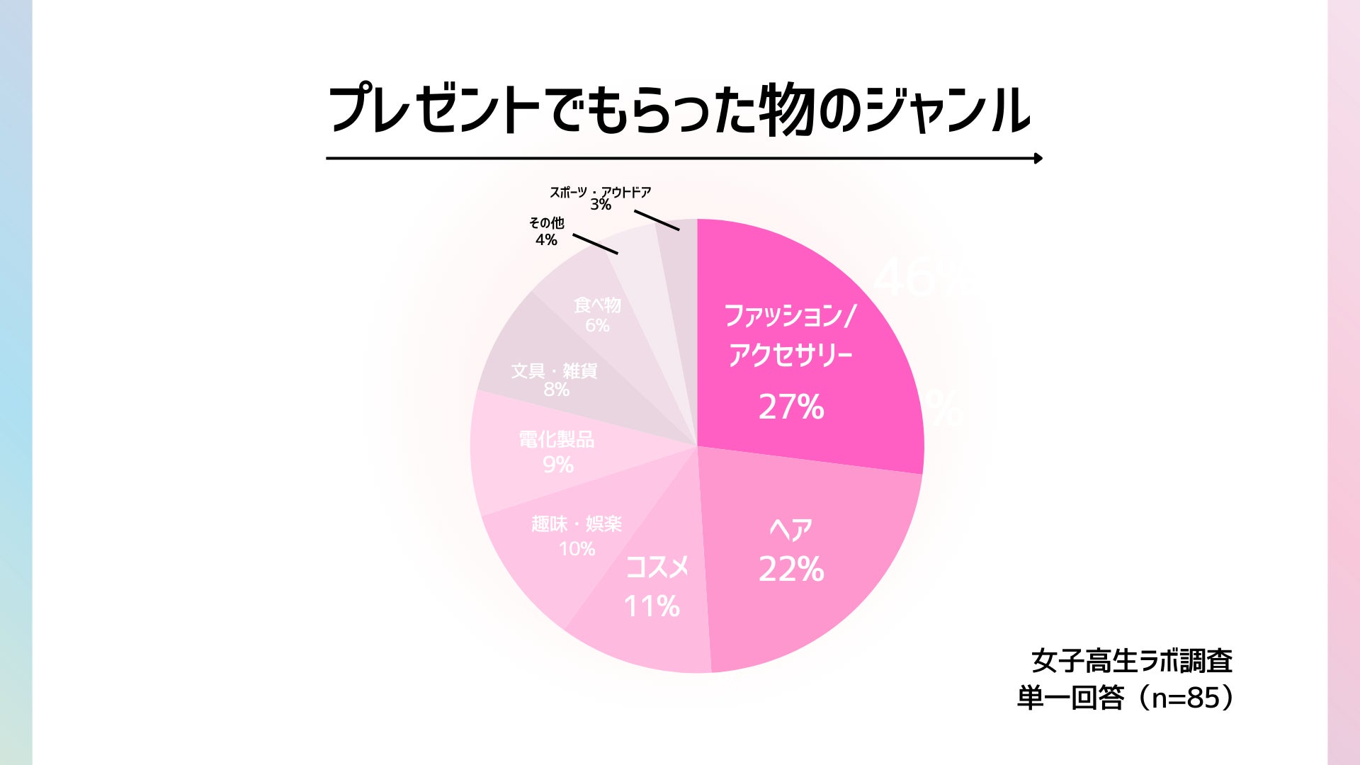 ジャンル別では、「ファッション・アクセサリー系(27%)」と「ヘア系(22%)」「コスメ系(11%)」が上位を占めました。トレンドを取り入れやすく、自己表現の手段として、美容関連アイテムが圧倒的な支持を得ています。