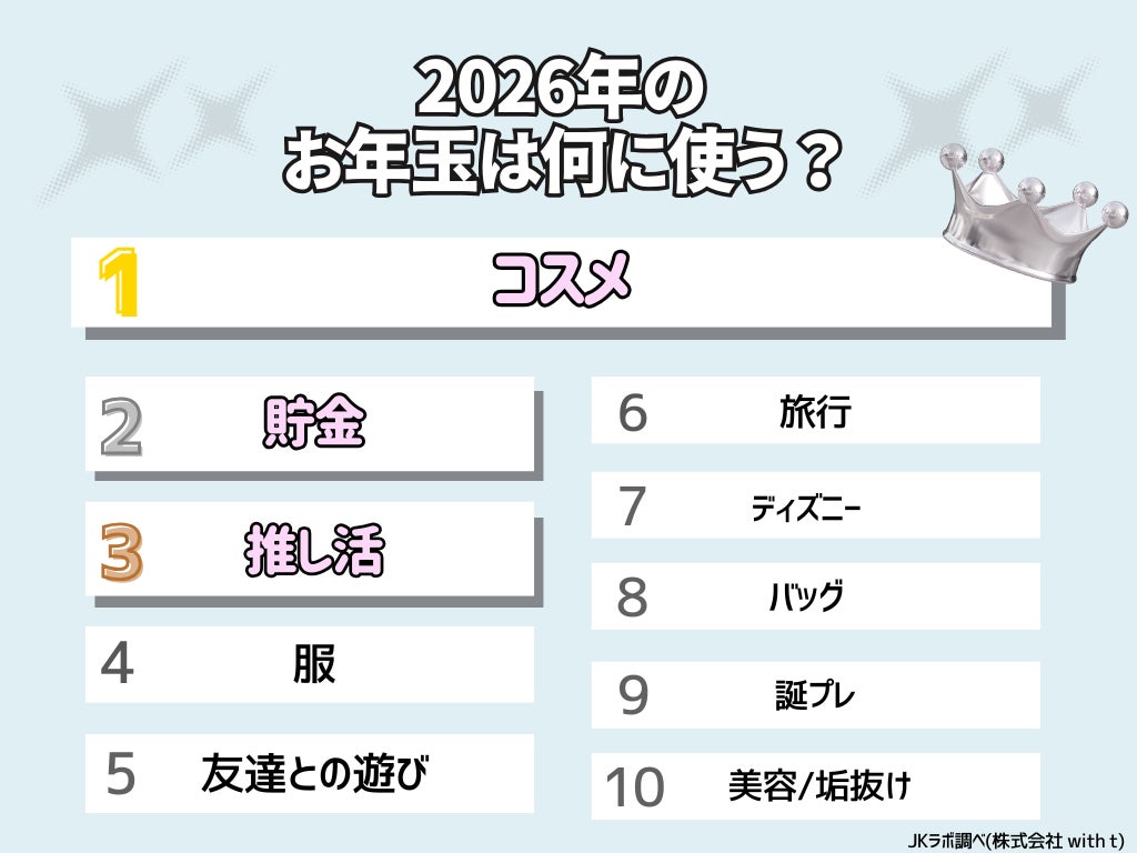 クリスマスとは対照的に、お年玉の使い道1位は「コスメ」でした。比較的手に取りやすい価格帯のコスメを自分で選び、新学期や新しい自分への準備(自己投資)として前向きにお金を使っている様子がわかります。
