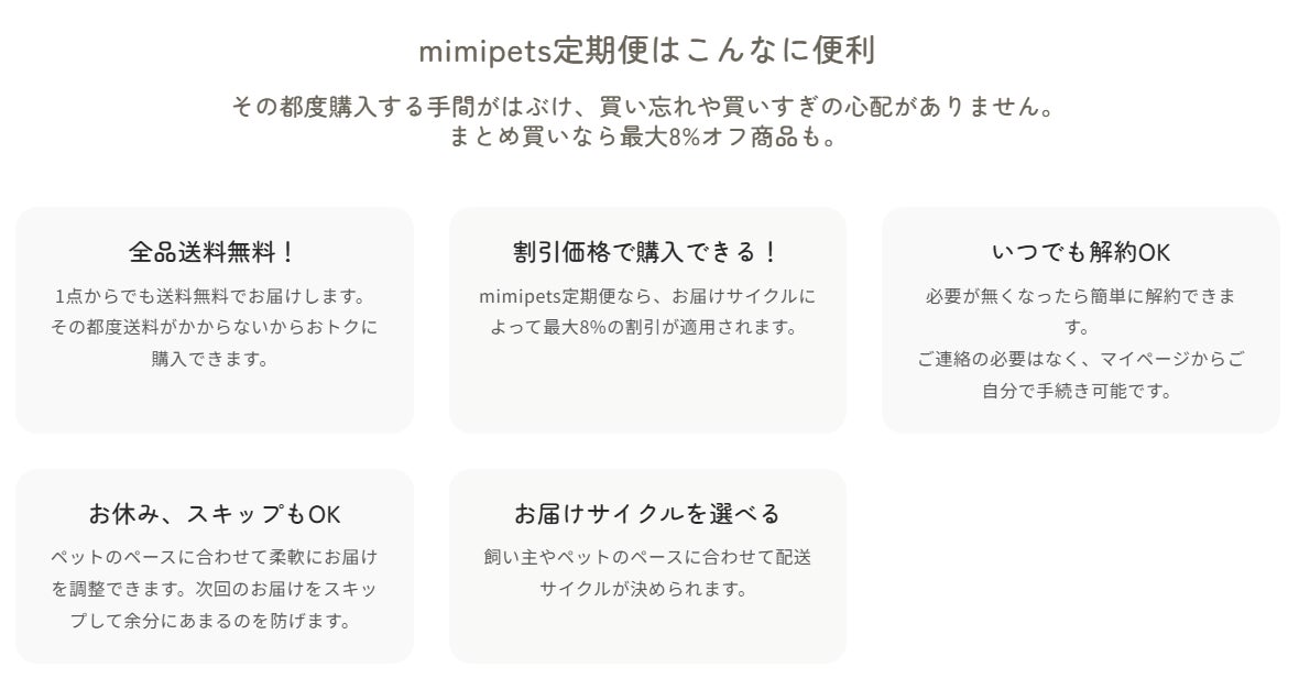 mimipets定期便なら、お届けサイクルによって最大8%の割引が適用されます。