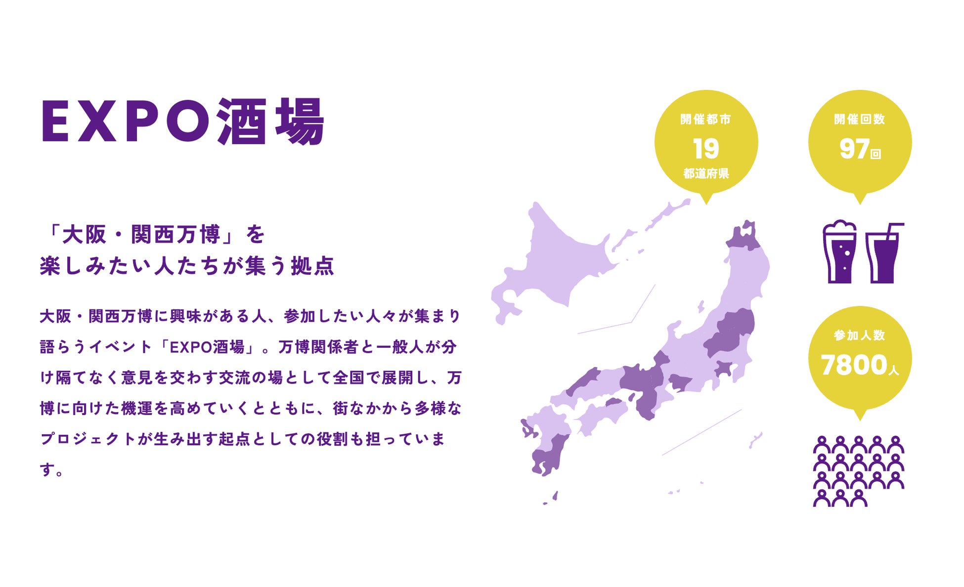 大阪・関西万博に興味がある人、参加したい人々が集まり語らうイベント「EXPO酒場」。万博関係者と一般人が分け隔てなく意見を交わす交流の場として全国で展開し、万博への機運を高めていくとともに、街なかから多様なプロジェクトが生み出す起点としての役割も担ってきました。これまで全国19都府県で開催され、参加者は延べ7,800人以上にのぼります。
