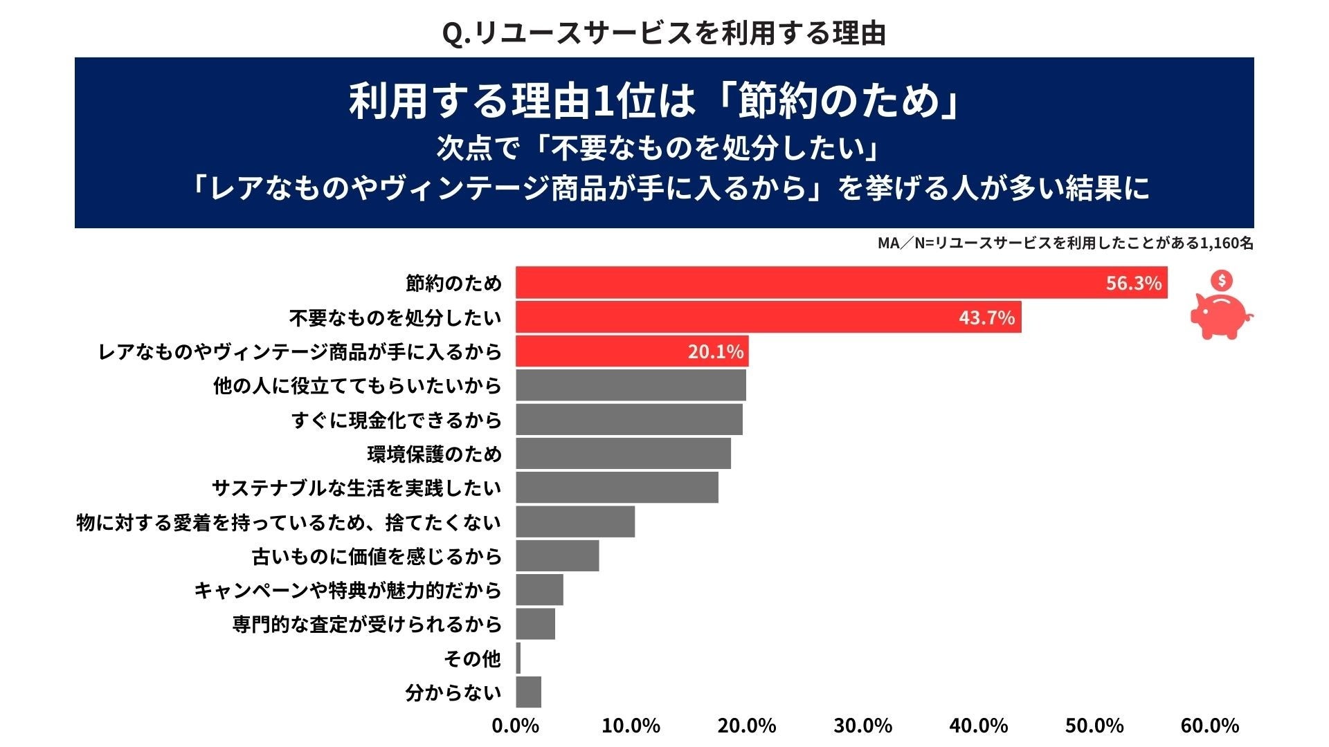 リユースサービスを年に1回以上利用している1,160名に対して、利用理由を調査したところ、「節約のため(56.3%)」と「不要なものを処分したい(43.7%)」を挙げる人が多いことが明らかになりました。物価上昇が続く中、消費者の生活防衛意識の高まりによる節約志向に加え、家の整理や不要品を手放すことなどを目的にリユースサービスを利用するニーズが高いことがうかがえます。