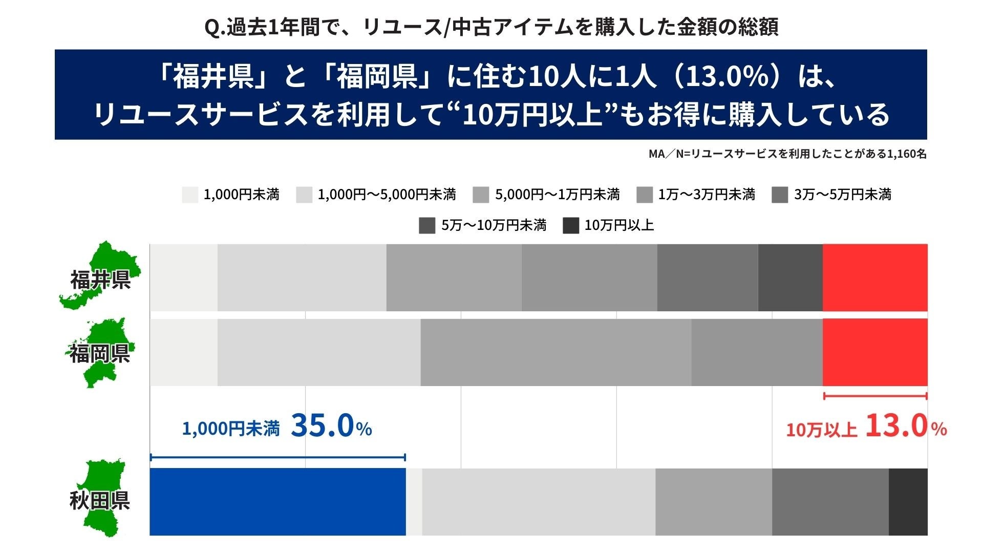 次に、リユースサービスが具体的にどのくらい利用されているかを調査しました。リユース/中古アイテムの購入経験があると回答した1,122名に対して、過去1年間で購入した金額の総額を尋ねたところ、「1,000円~5,000円未満」と回答する割合が最も多い(35.0%)結果でした。都道府県別に見ると、「福井県」と「福岡県」で調査に参加した人の13.0%が、過去1年に“10万円以上”購入しており、全体平均の3.7%を大きく上回っています。