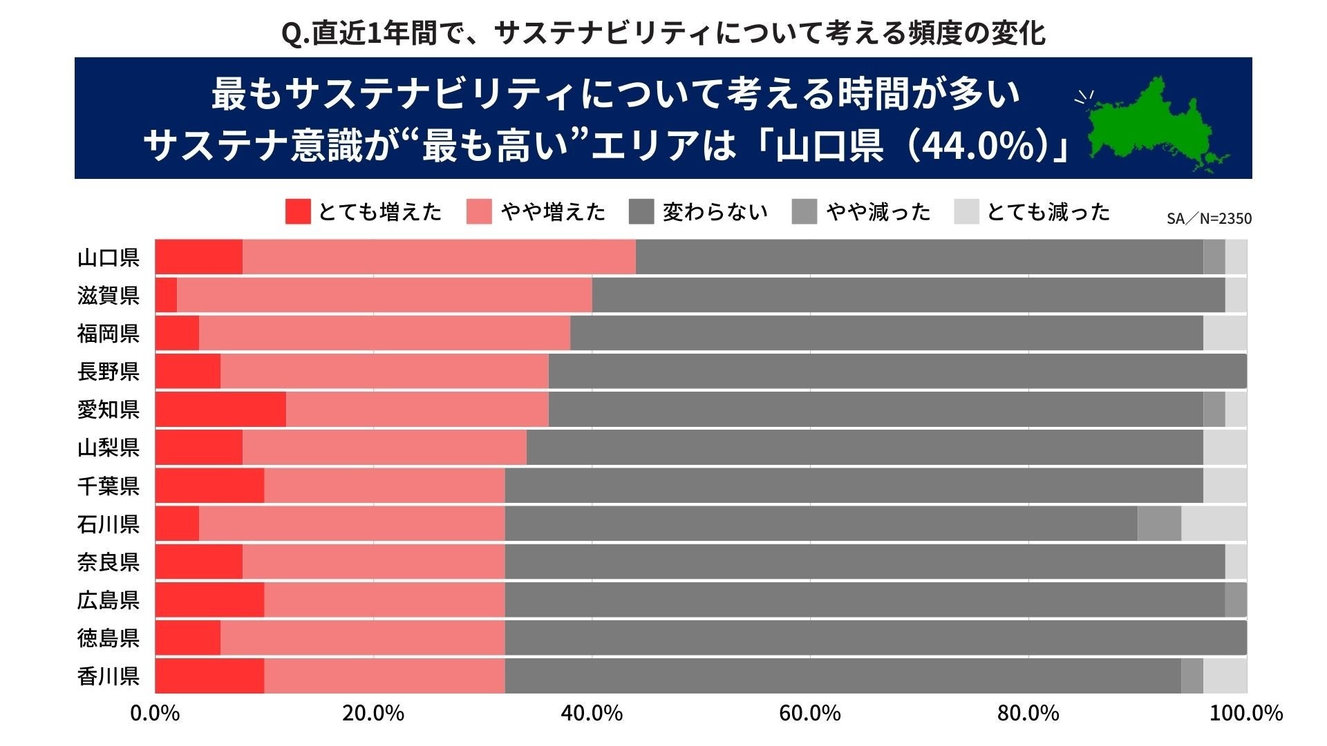 1. サステナビリティについて考える頻度が最も増えたのは「山口県(44.0%)」。