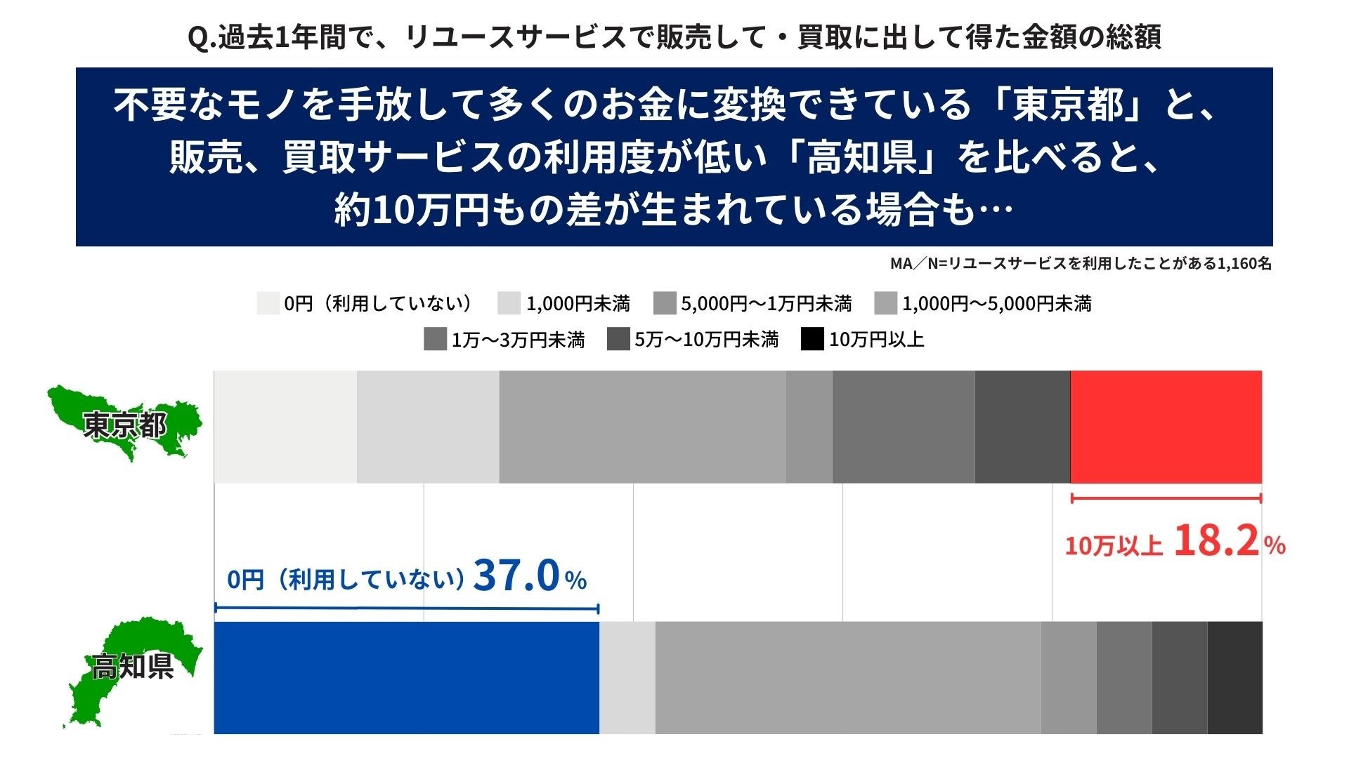 最後に、リユースサービスを年に1回以上利用している1,160名に対して、過去1年間でリユースサービスを通じて得た金額を調査したところ、「1,000円~5,000円未満」と回答した人が最も多く(27.8%)なりました。都道府県別では、「東京都」で調査に参加した人の18.2%が“10万円以上”も換金できており、全体の3.8%を4倍以上も上回っています。一方、「高知県」で調査に参加した人は、「0円(販売・買取サービスは利用していない)」と回答した人が最も多く(36.8%)なりました。