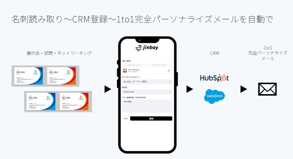 ジンベイが新たに提供する「アポメイト」は、こうした課題を解消する展示会特化型の営業支援AIツールです。名刺情報と手書き・紙の接客メモをまとめてOCR+AIで読み取り、顧客名・企業名・ニーズ・温度感・フォロー希望時期などを自動で整理・構造化。そのままHubSpotやSalesforceなどのCRMに一括登録が可能です。さらに、各情報から完全パーソナライズされたメール文面の作成も可能です。
