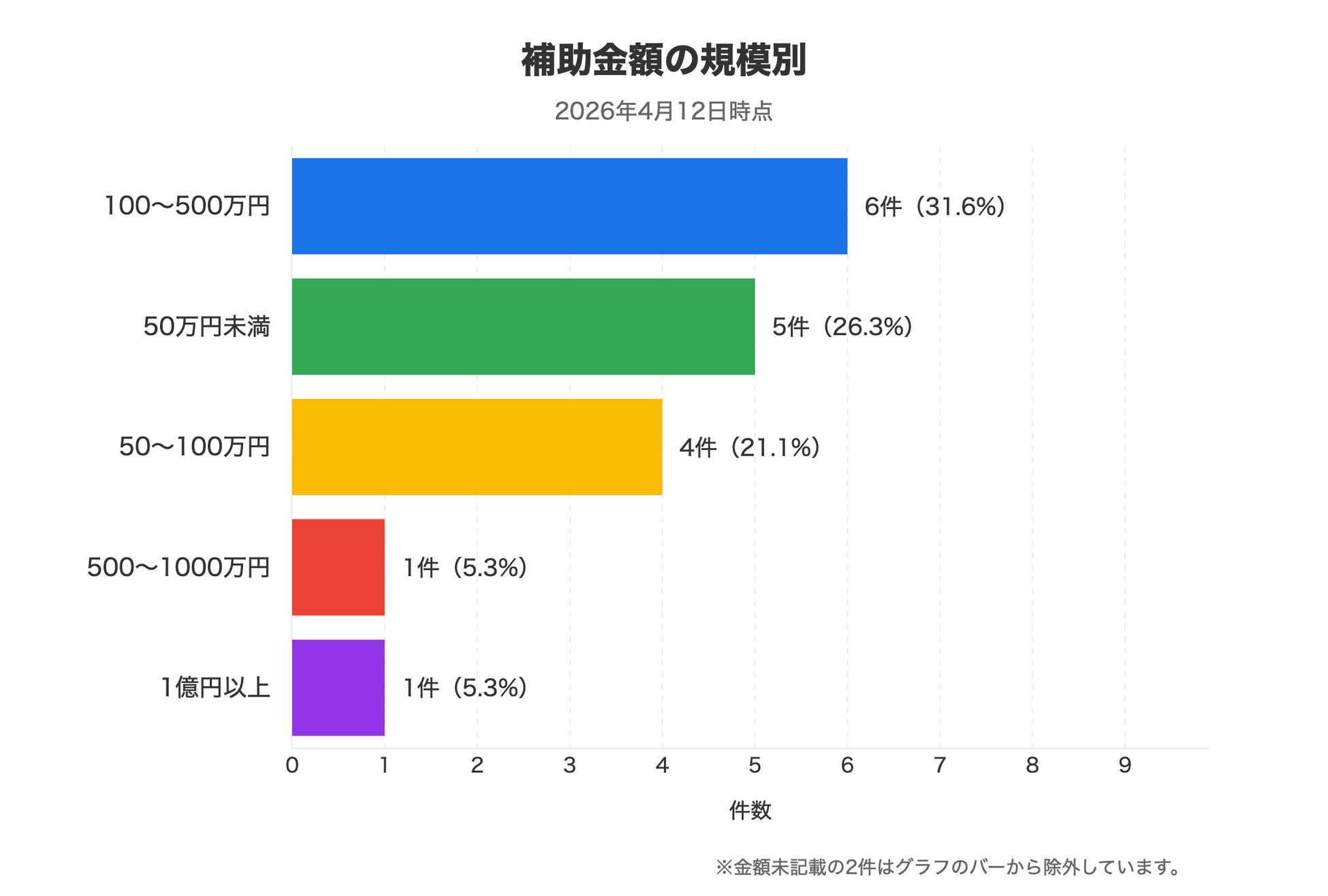 100〜500万円帯の制度は6件(31.6%)で、設備導入や職場環境整備に関連した内容が中心です。50万円未満の制度も5件あり、賃上げ支援や研修費補助など少額定額の地域支援型制度が含まれます。