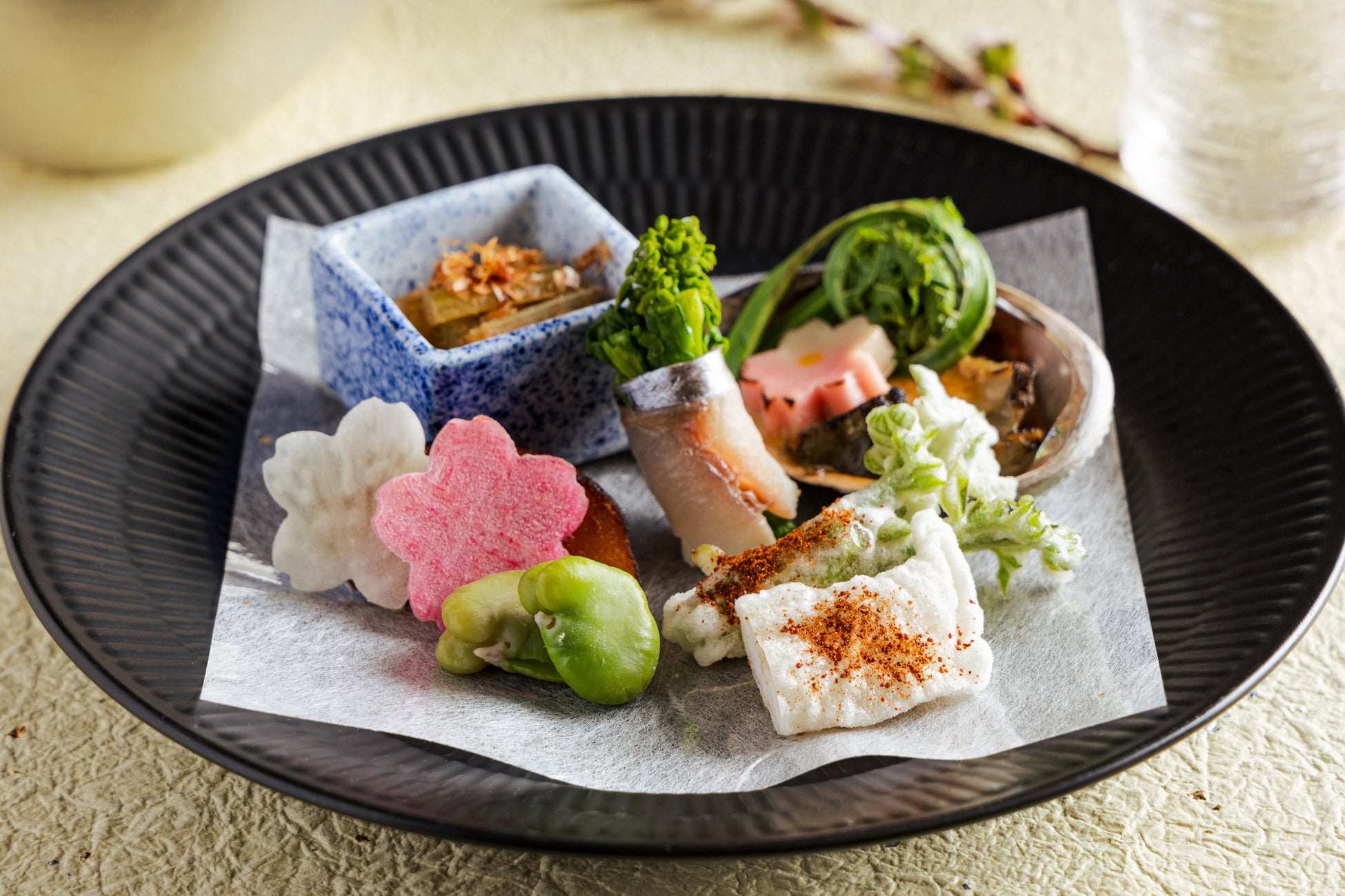 4月は、みずみずしいアスパラガスと味噌を合わせたすり流しに雲丹を添えた先付に始まり、こごみと桜麩を添えた鮑の味噌焼きを盛りつけた、春らしい彩りの八寸など、産地にこだわった厳選食材をふんだんに使用した、当店でしか味わえない逸品のコース料理をお届けいたします。