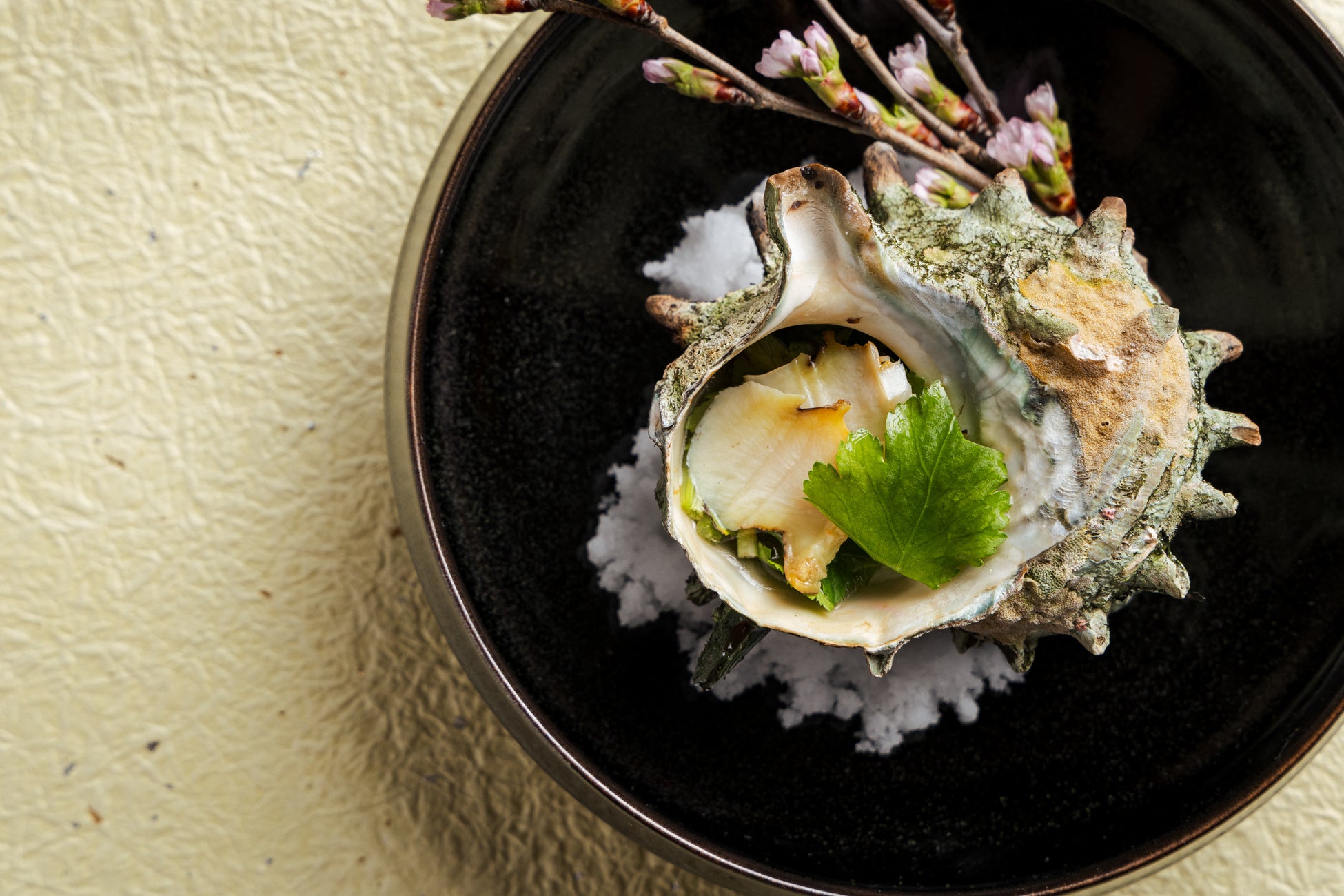 アスパラガスと味噌を合わせたすり流しの雲丹添えや、こごみと桜麩を添えた鮑の味噌焼きなど、厳選した旬の食材を提供