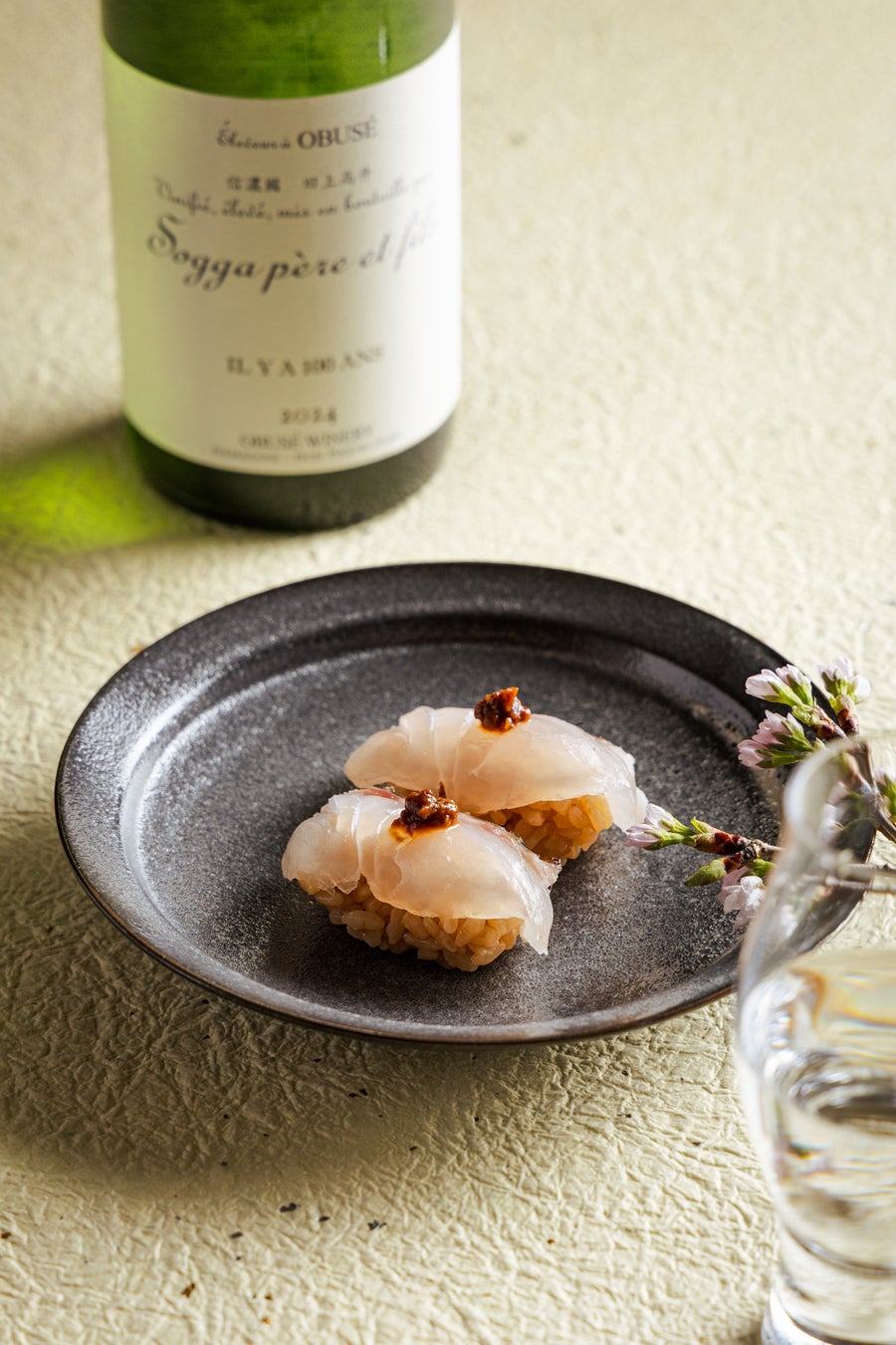 4月の一皿として、お凌ぎの「春鯛握り 味噌もろみ」に長野県小布施町の「ソガペール・エ・フィス」をペアリングしてご提供いたします。幻の日本酒「ソガペール・エ・フィス」は、長野県の小布施ワイナリーが時期と数量を限定して販売する銘柄で、香りの芳醇さが人気のお酒です。もともとは清酒蔵であったワイン農園のオフシーズンに、スタッフ一同で製造しています。家宝として保存し続けた酵母をもとに、古典的な生酛造(きもとづくり)にて日本酒の復活がかなっています。