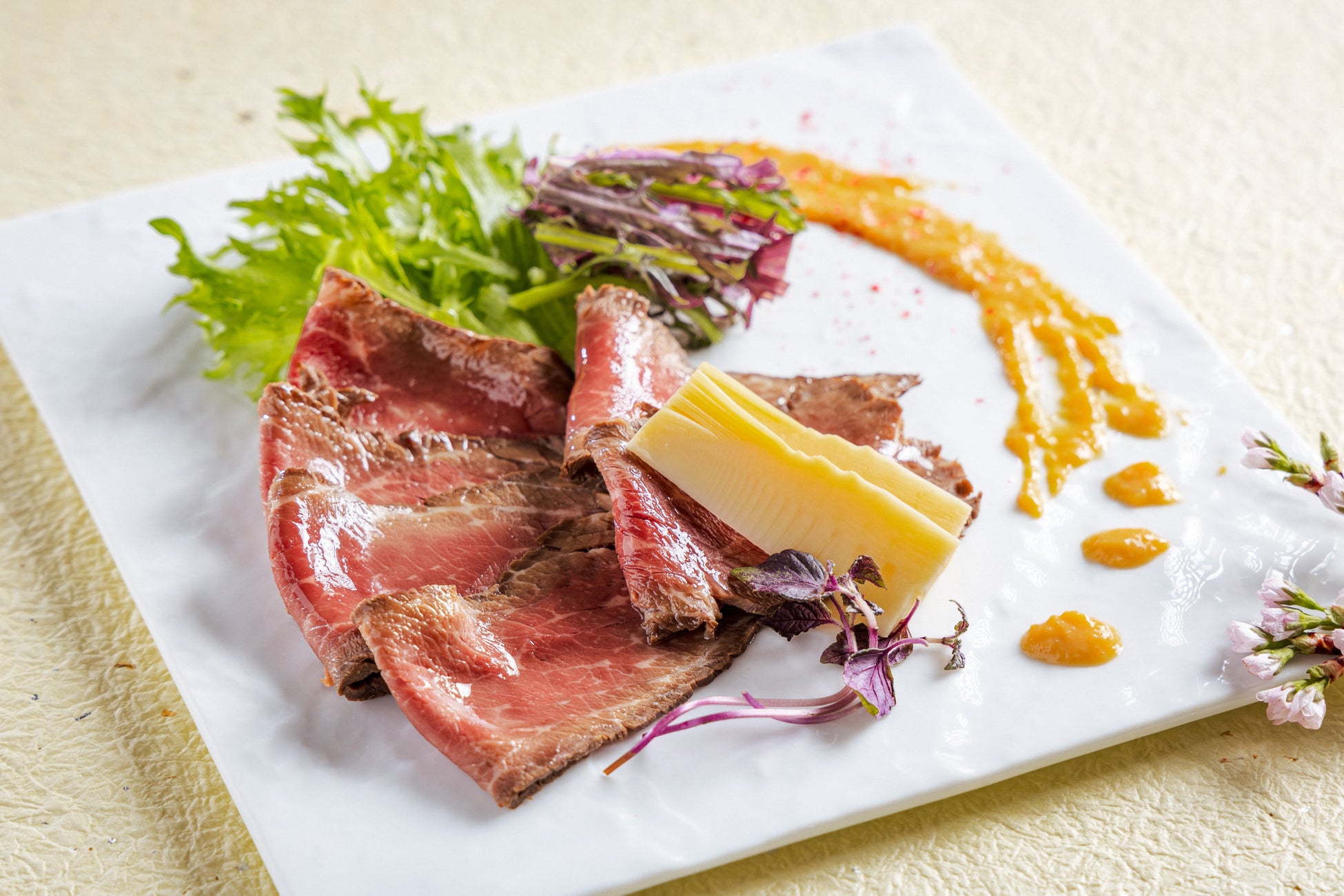 尾崎牛ローストビーフ 筍 新玉ねぎの味噌ソース サラダ野菜