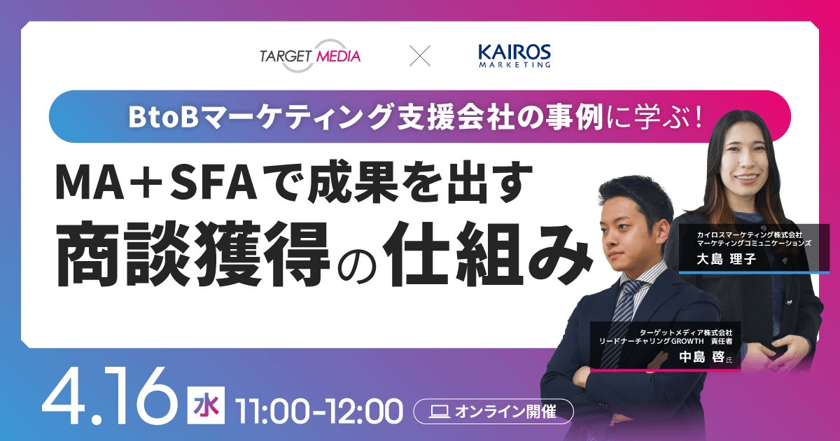 “次の一手“がデータでわかるMA+SFA一体型ツール「Kairos3(カイロススリー)」を提供するカイロスマーケティング株式会社(本社:東京都渋谷区、代表取締役:佐宗 大介、以下「カイロスマーケティング」)は、ターゲットメディア株式会社(本社:東京都港区、代表取締役:佐竹 正臣、以下「ターゲットメディア」)との共催セミナー「BtoBマーケティング支援会社の事例に学ぶ!MA+SFAで成果を出す商談獲得の仕組み」を4月16日(水)に開催いたします。