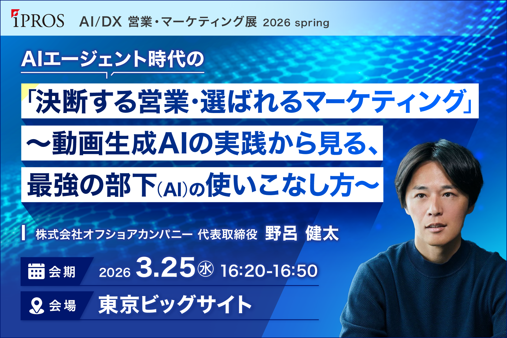 株式会社ベクトル(本社:東京都港区、代表取締役社長CEO:西江 肇司、東証プライム:6058、以下ベクトル)のグループ会社であり、AIを活用したSaaS事業を中心にTech領域を担う株式会社オフショアカンパニー(本社:東京都港区、代表取締役:野呂 健太、以下オフショアカンパニー)は、2026年3月24日(火)・25日(水)に東京ビッグサイトにて開催される展示会「AI/DX営業・マーケティング展 2026 Spring」において、代表取締役の野呂 健太がセミナーに登壇することをお知らせいたします。