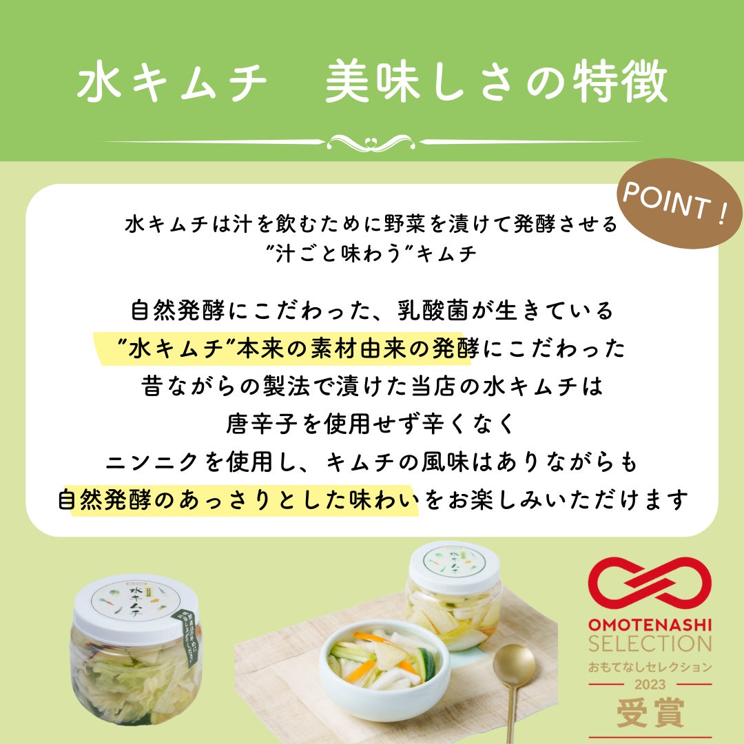 素材由来の発酵だからこその、生きた乳酸菌が豊富な水キムチだからこその風味をぜひお楽しみください。