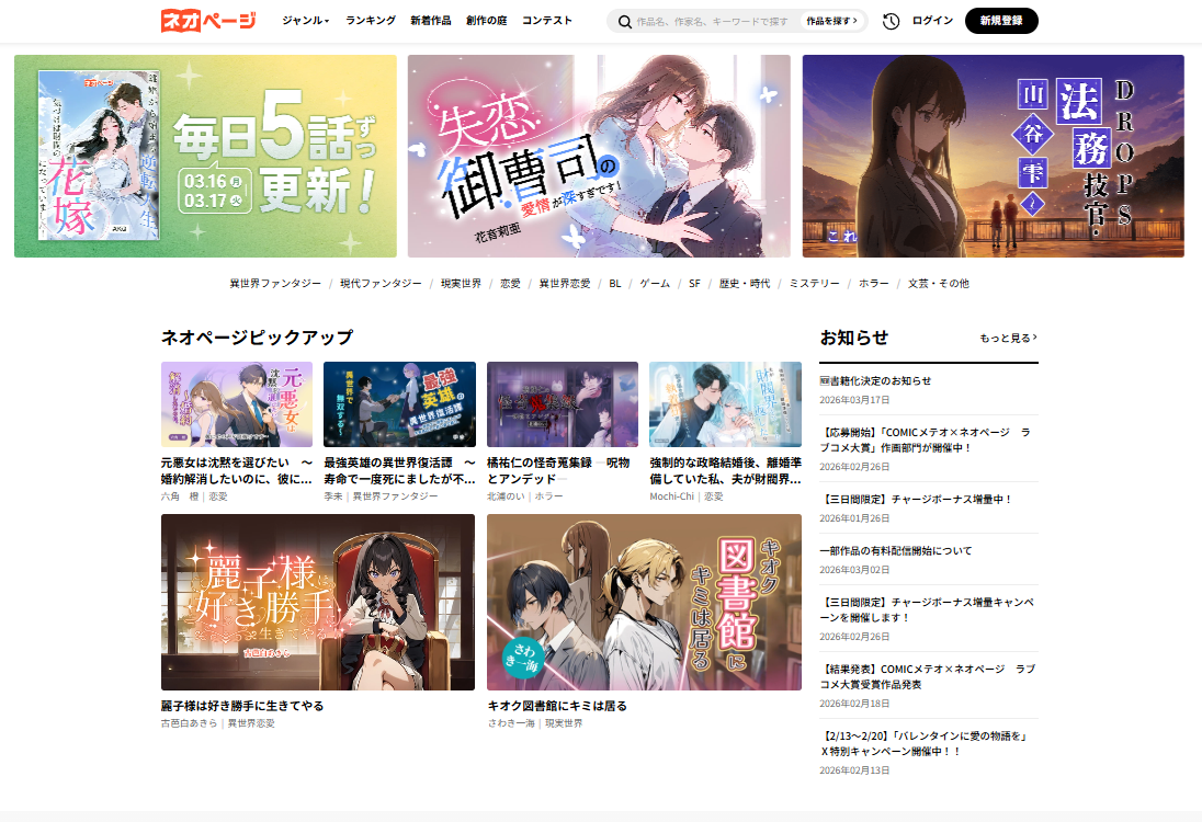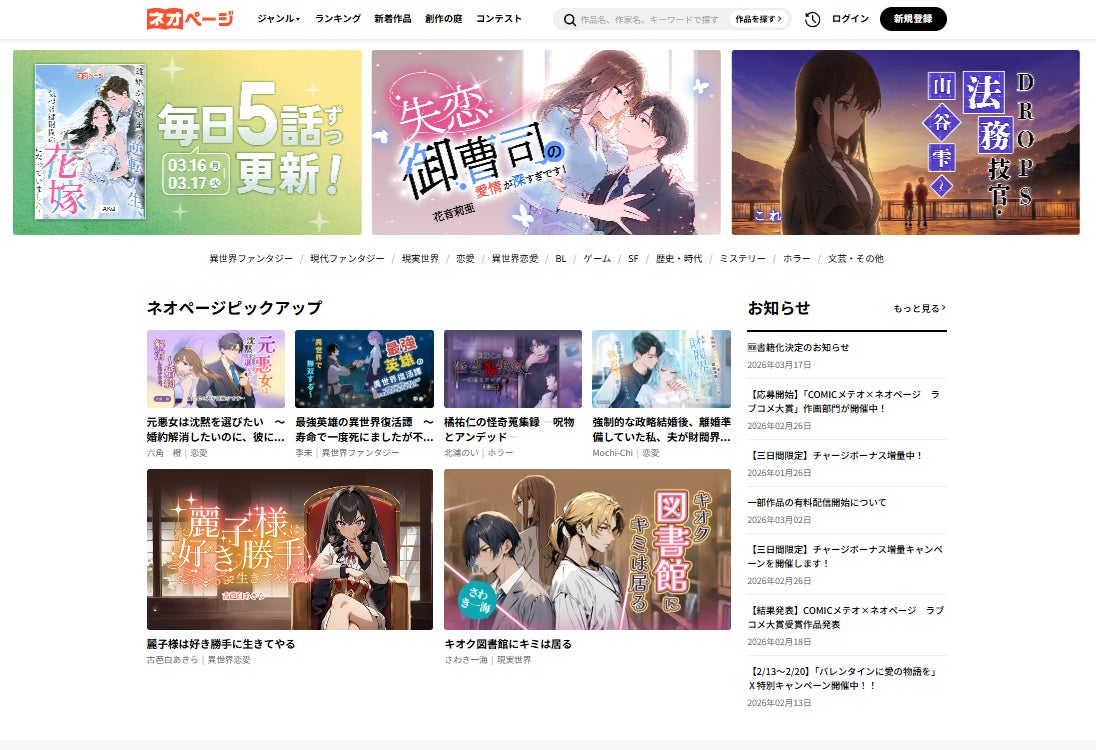 ネオページは、次世代の才能発掘とIP創出を目指すWEB小説投稿サイト。