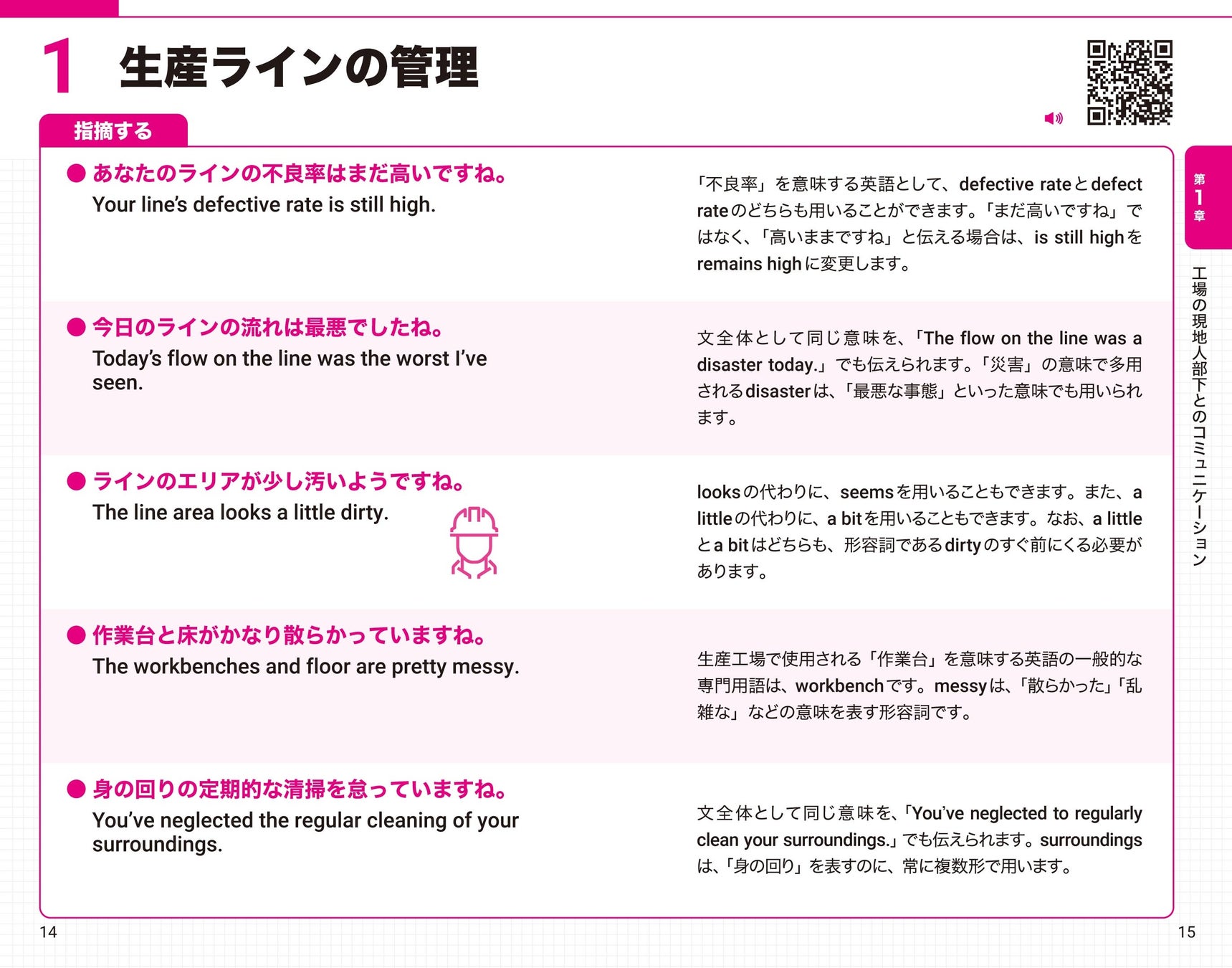 海外では、とにかく言葉ではっきりと意思を伝えることが大切です。そこでこの本では、現場でのコミュニケーションを「指摘する」「質問する」「注意する」「指示する」「提案する」に分類して、言いたいことをしっかり伝えるフレーズにこだわりました。