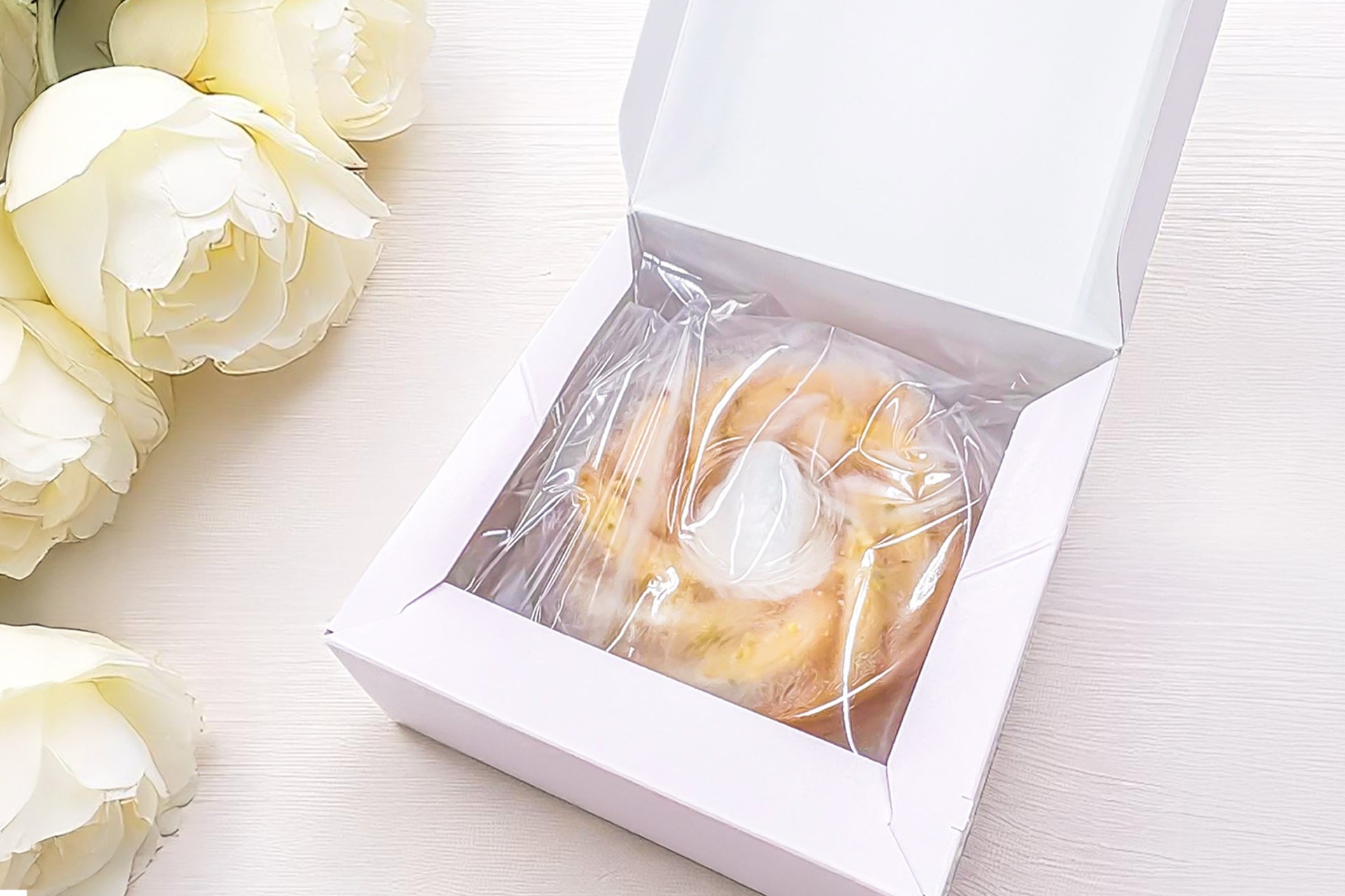 箱を開けると、中身もまたかわいらしさがあふれる、とびきりの夏スイーツが登場。パッケージと中身が一体となって、夏の爽やかな甘さと贅沢感をお届けします。