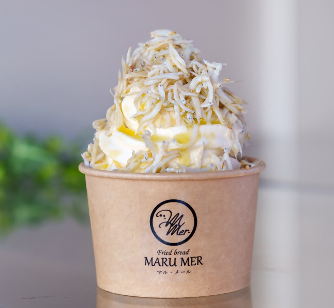用宗特産のしらすをたっぷりのせたソフトは、隠し味の白ゴマとお醤油、仕上げにオリーブオイルで癖になる美味しさ。お好みで一味のトッピングもできます。