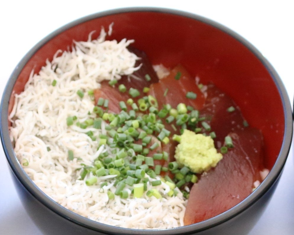 用宗漁港で水揚げされたしらすの釜揚げと清水港で水揚げされたマグロの漬けが一緒に入った二色丼です。