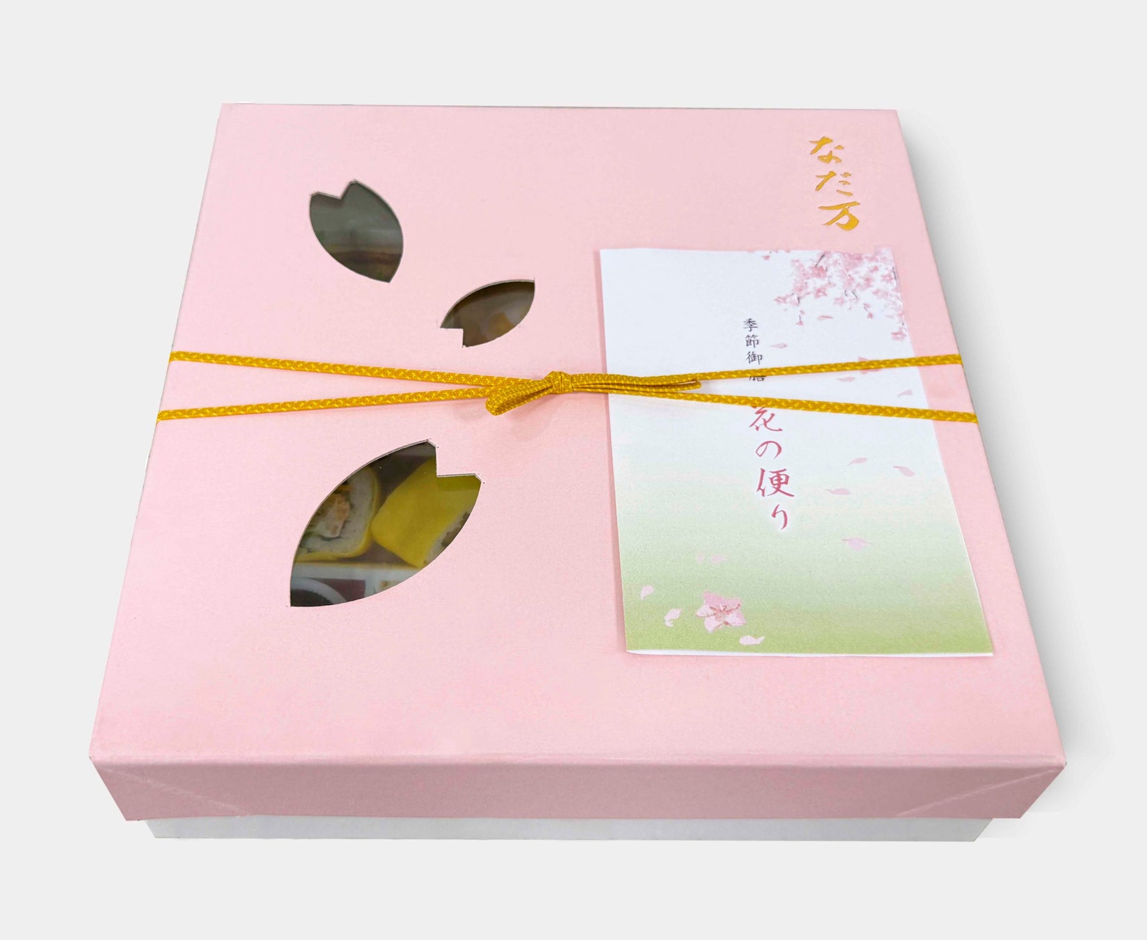華やかなピンク色の折箱には、出汁をたっぷり含ませた煮物、ポテトサラダ、豚角煮など、幅広い年代にご満足いただける料理を詰め合わせました。また、海老や錦糸卵が彩られたちらし寿司に緑のアクセントが美しい甘味の抹茶プリンなど、目にも鮮やかなお料理が、お花見のシーンを一層引き立てます。さらに、裏面にお品書きを記載したオリジナルデザインの掛け紙は、野外でも膝の上に敷いてお召し上がりいただけるよう、少し大きめのサイズでご用意しました。