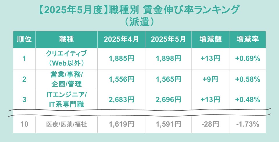 派遣の職種別賃金伸び率ランキング(前月比)トップ3は、1位が「クリエイティブ(Web以外)」(増加額+13円、増加率+0.69%)、2位が「営業/事務/企画/管理」(増加額+9円、増加率+0.58%)、3位が「ITエンジニア/IT系専門職」(増加額+13円、増加率+0.48%)でした。