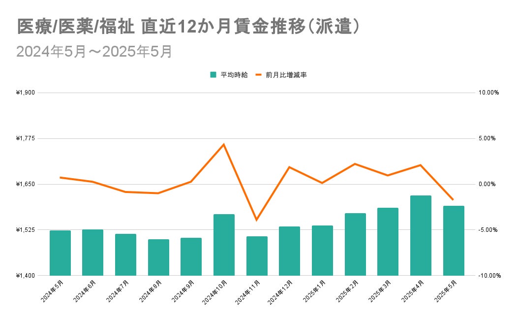 「医療/医薬/福祉」は2024年10月に特定の派遣会社が高時給求人を複数出稿したことで平均時給が大きく上昇しました。その後、これらの高時給求人が掲載終了となった影響で、2024年11月には平均時給が急落。以降は上昇傾向が続いていましたが、2025年4月から5月にかけては1,619円から1,591円へと下落し、6か月ぶりに減少へ転じました。