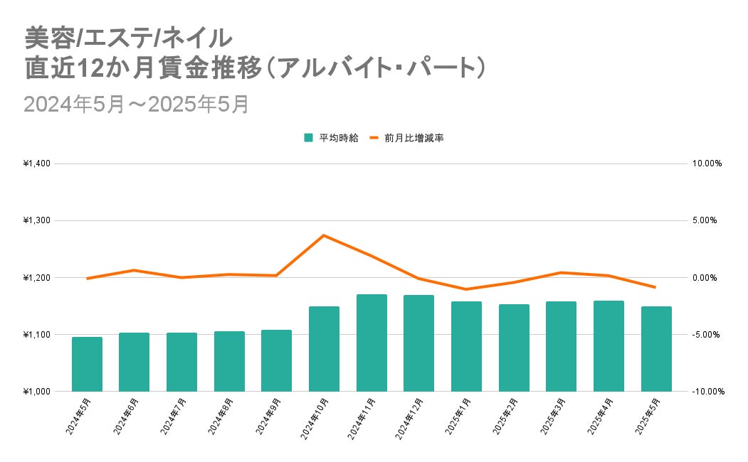 1位の「営業/事務/企画/管理」と13位の「美容/エステ/ネイル」における直近12か月の賃金推移を比較すると、「営業/事務/企画/管理」は平均時給1,200円台を安定して維持し、2025年4月から5月にかけては41円増加して1,280円に到達。1,300円台目前まで上昇しています。複数の派遣企業による時給下限平均1,800円の高時給求人が複数出稿されたことが大きく影響しました。