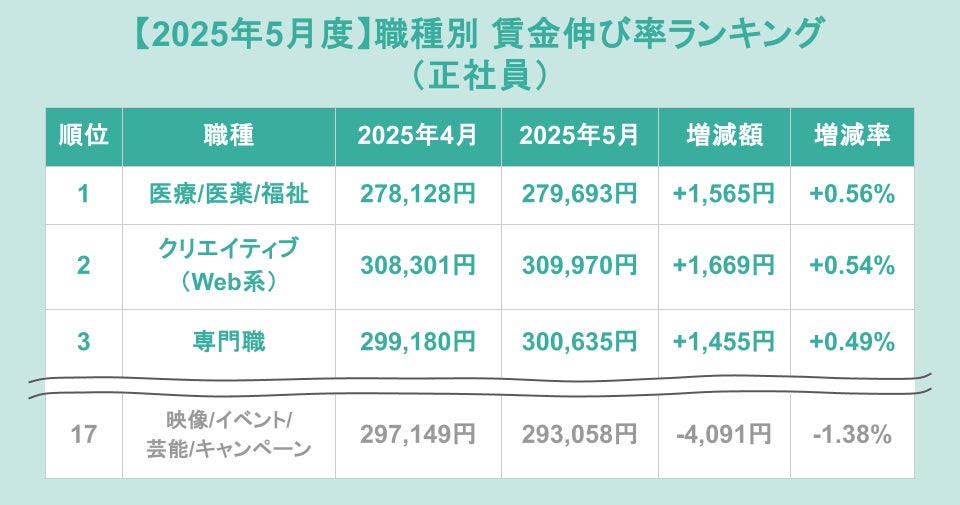 正社員の職種別賃金伸び率ランキング(前月比)トップ3は、1位が「医療/医薬/福祉」(増加額+1,565円、増加率+0.56%)、2位が「クリエイティブ(Web系)」(増加額+1,669円、増加率+0.54%)、3位が「専門職」(増加額+1,455円、増加率+0.49%)でした。