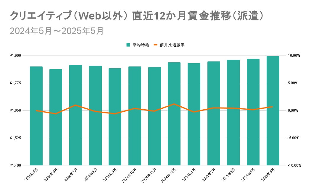 1位の「クリエイティブ(Web以外)」と10位の「医療/医薬/福祉」における直近12か月の賃金推移を比較すると、「クリエイティブ(Web以外)」は平均時給1,800円以上の高水準を維持しながら横ばいで推移しています。