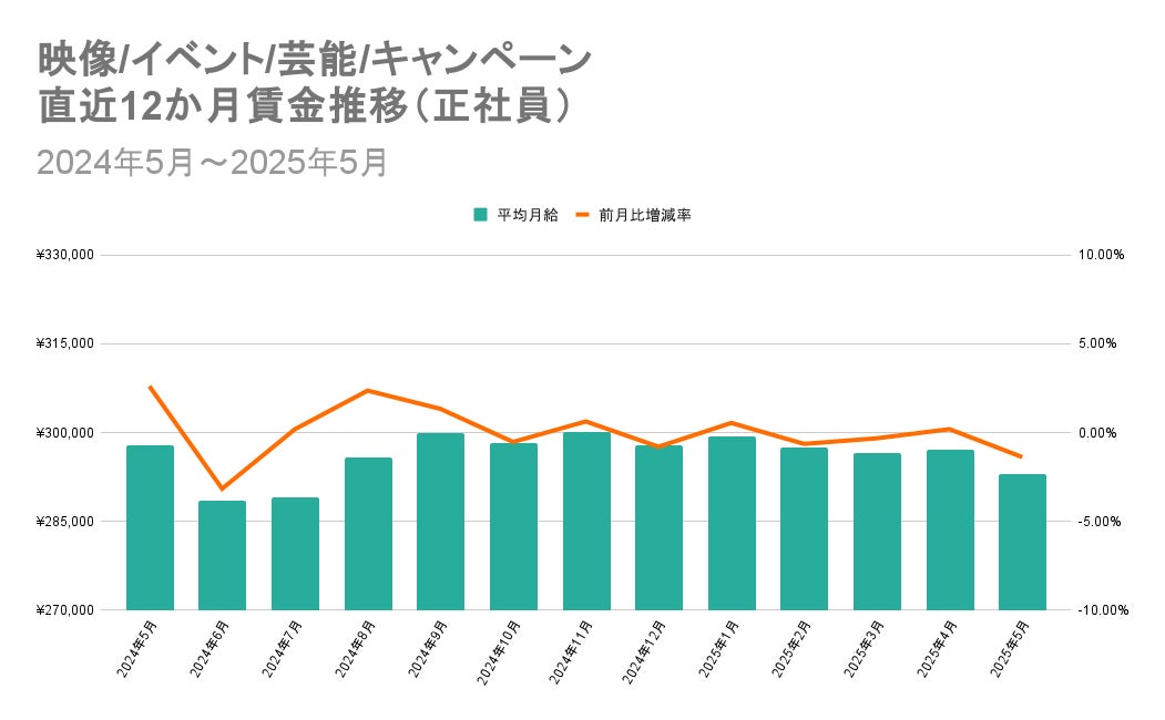 「映像/イベント/芸能/キャンペーン」は2024年5月から6月にかけて賃金が大幅に減少しました。全体的に月給30万円未満の求人が増加し、30万円以上の求人が減少したことが影響しています。8月にかけて月給30万円以上の求人が増加したことで賃金も上昇。その後はおおむね横ばいで推移していましたが、2025年に入ってからは緩やかな減少傾向が続いています。