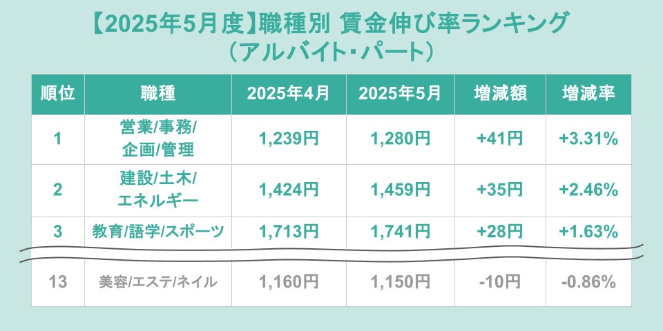 求人サイト主要9媒体から雇用形態別に分析!アルバイト・パートでは事務系が前月比+3.31%で1位【2025年5月度 職種別 賃金伸び率ランキング】