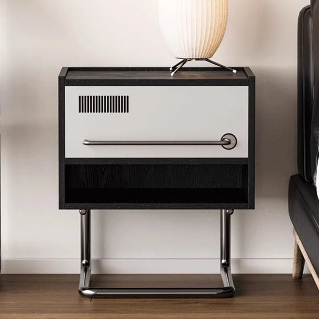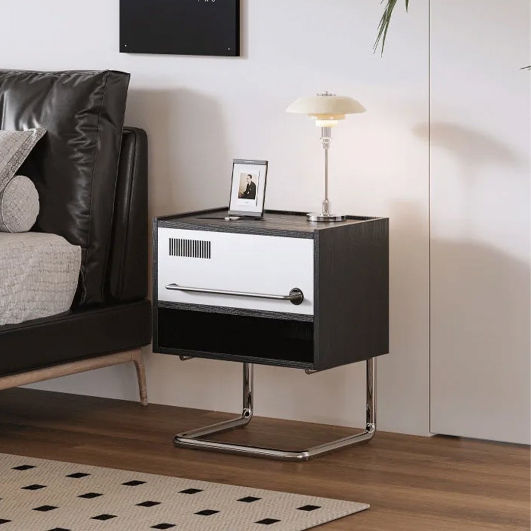 スピーカーを思わせるユニークなフォルムが目を引くキャビネット。天然木の引き出しとステンレス製の脚部が組み合わさり、モダンで上質な雰囲気を演出します。小物から書籍までをきれいに収められ、デザインと実用性のどちらも叶えるワンアイテム。