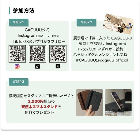 ご来場の皆様へ、特別な体験とお得な特典をご用意しています。実際に家具を手に取り、触れて、体感できるこの機会に、CAGUUUならではの暮らしの魅力とお得な特典をぜひお楽しみください。