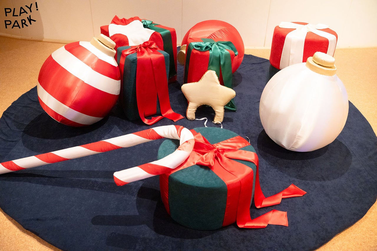 大きなクリスマスオーナメントをモチーフにした遊具が登場。てっぺん星をかぶったり、ボールの飾りを転がしたり、靴下の中に入ったり、キャンディーケーンにまたがったりできます。遊びながらフォトジェニックな写真が撮れる、親子にぴったりのフォトスポットです。