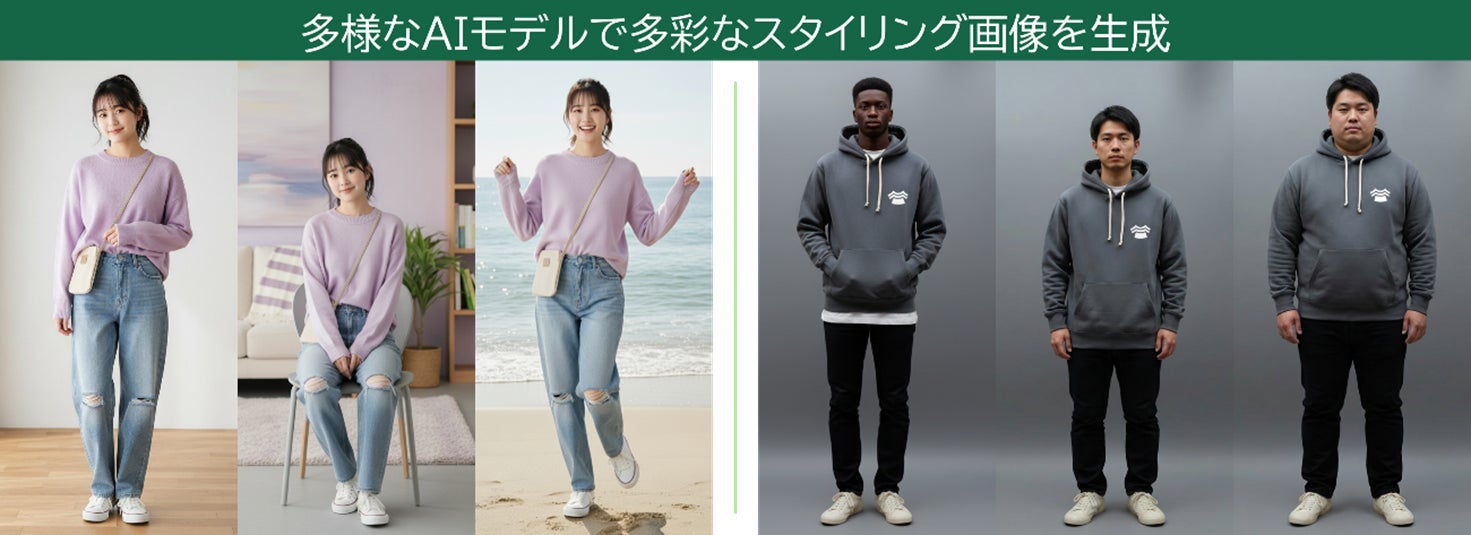 本サービスは画像生成AI を活用し、一枚の商品画像からブランドの世界観に合致した多彩なスタイリング画像をスピーディーに提供するサービスです。身体的特徴や雰囲気、ポーズや背景まで、AIモデルの着用イメージを自在に生成可能なため、これまでコストや時間の問題で表現しきれなかった商品の魅力を最大化し、ECサイトにおける戦略的なクリエイティブ活用と顧客体験(CX)向上に貢献します。